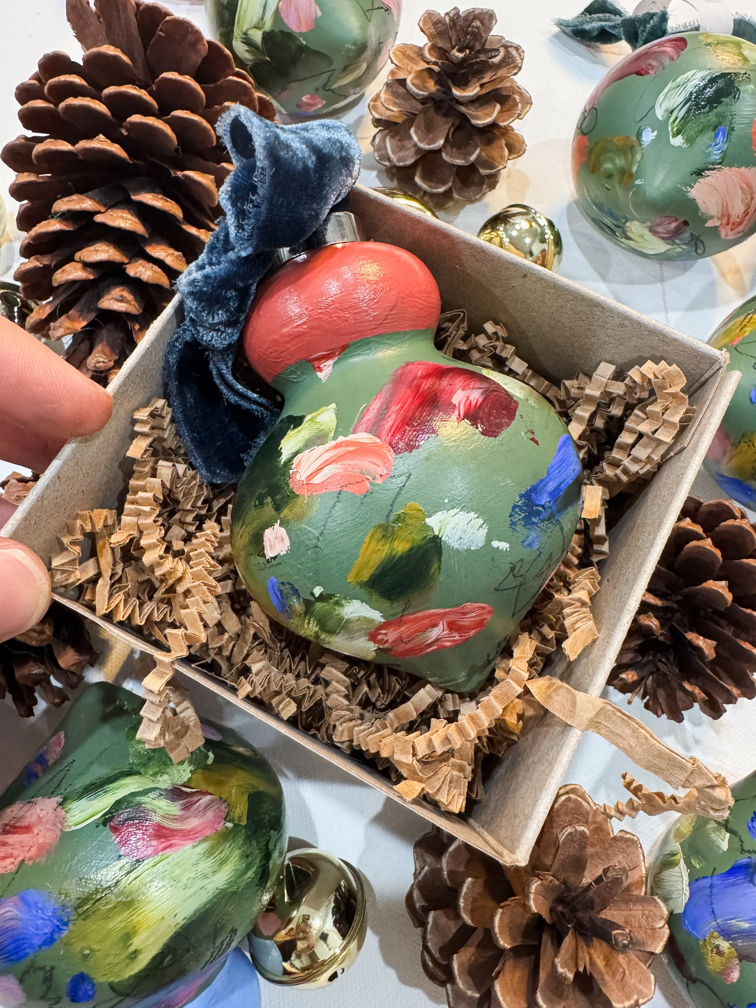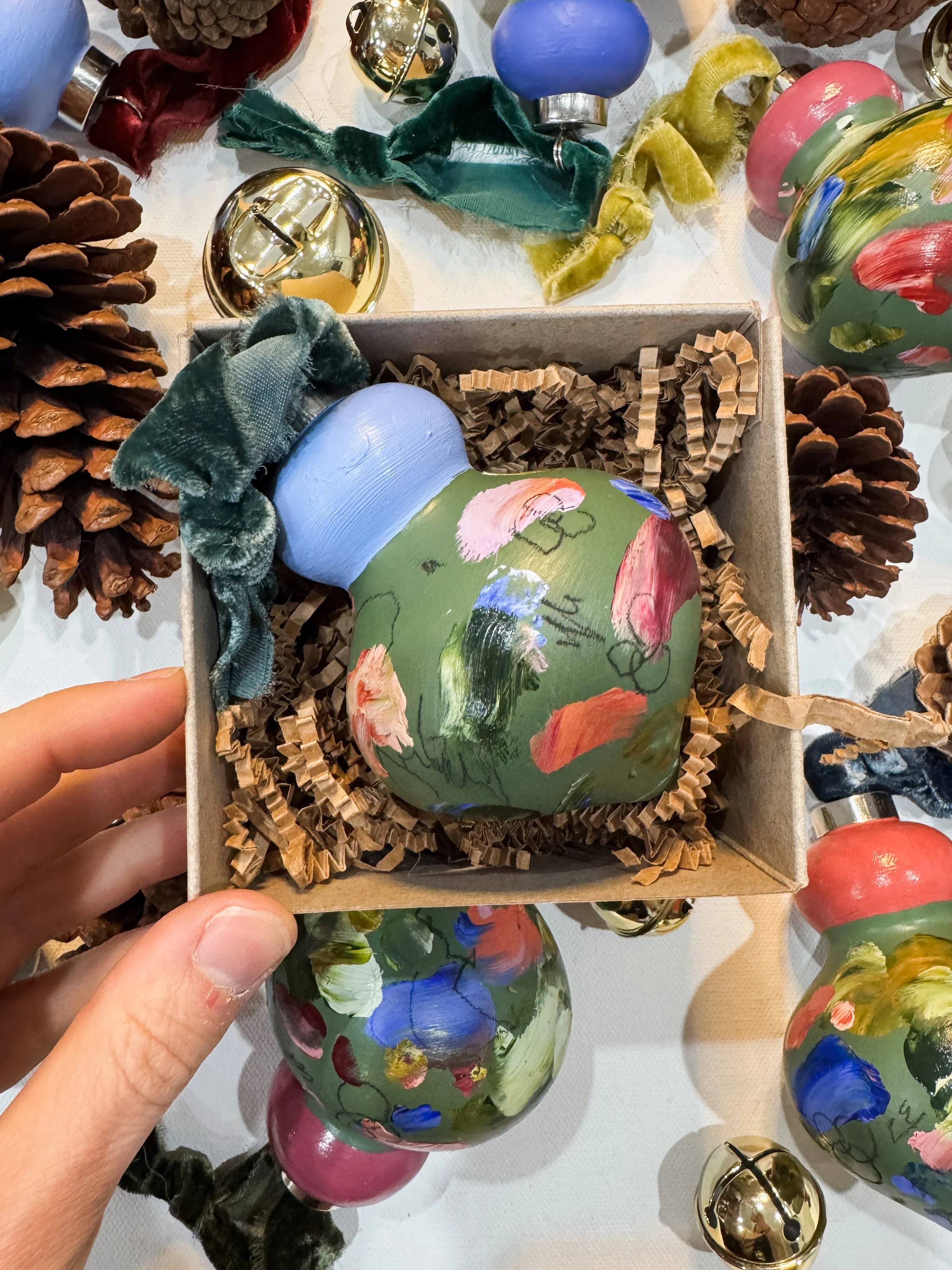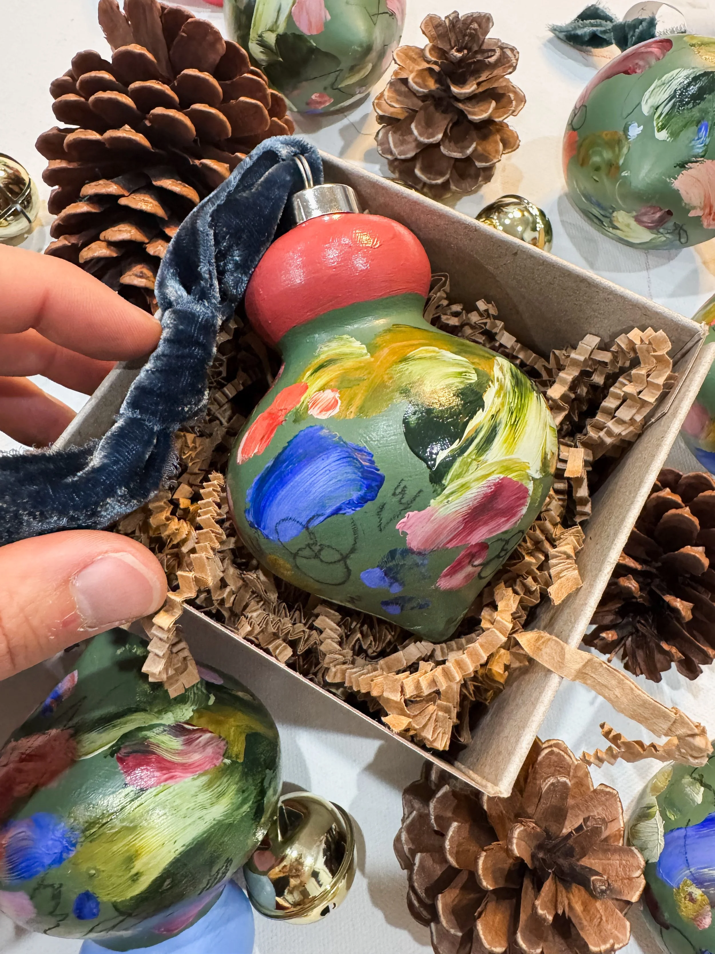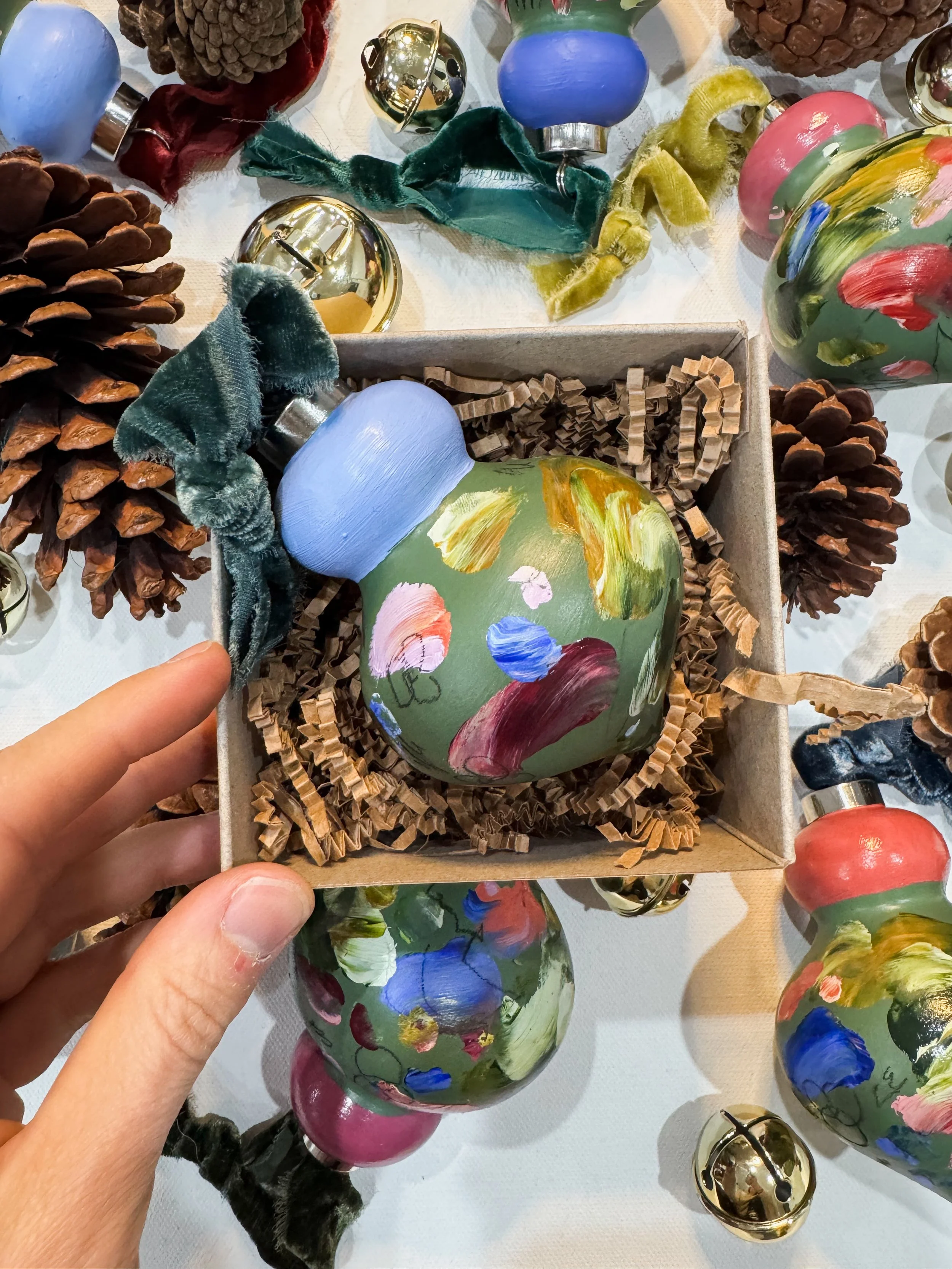 2025 “Touched” hand-painted, abstract holiday ornaments inspired by images of fuzzy bees covered in pollen and nectar visiting flower to flower, pollinating them in the process, and the beauty that is multiplied thereafter - by abstract artist, Marcy Parks.