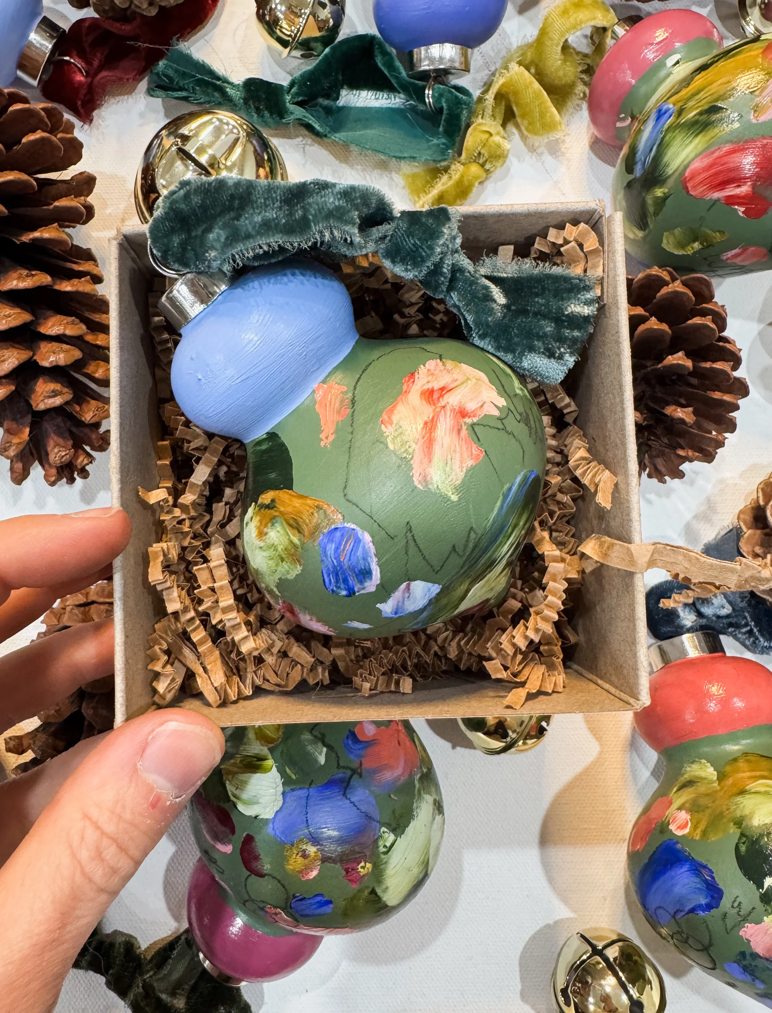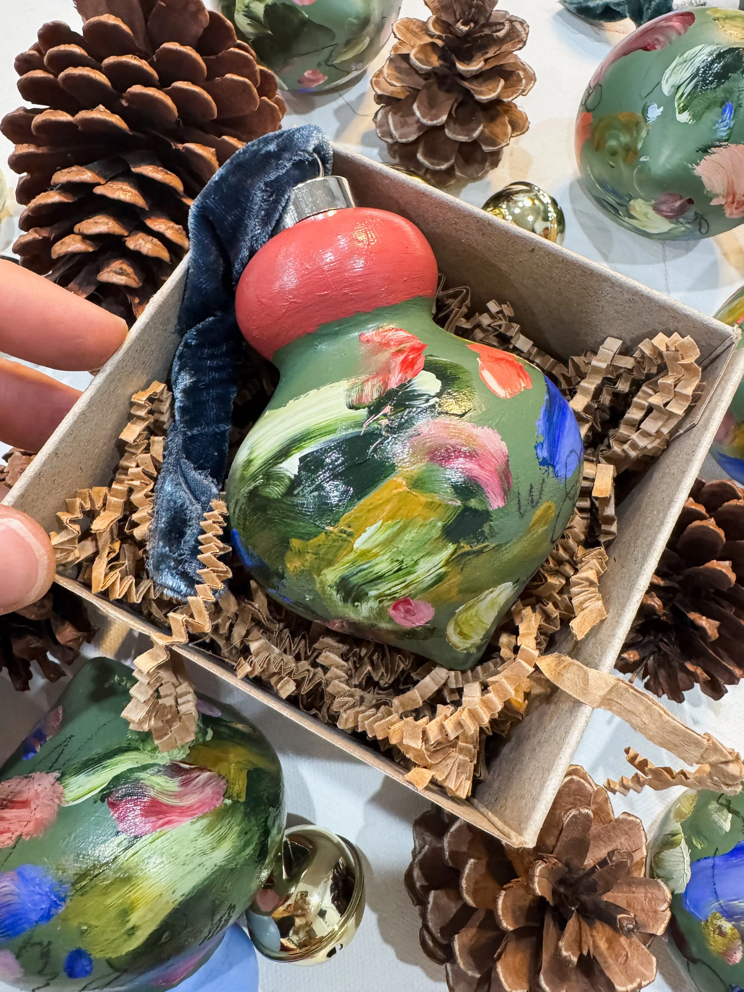 Each ornament is uniquely painted on a muted teal background with pops and swirls of bold colors for a modern influence and finished with hand-dyed, hand-torn velvet ribbon that make them perfect for adorning your holiday tree or as a thoughtful gift.