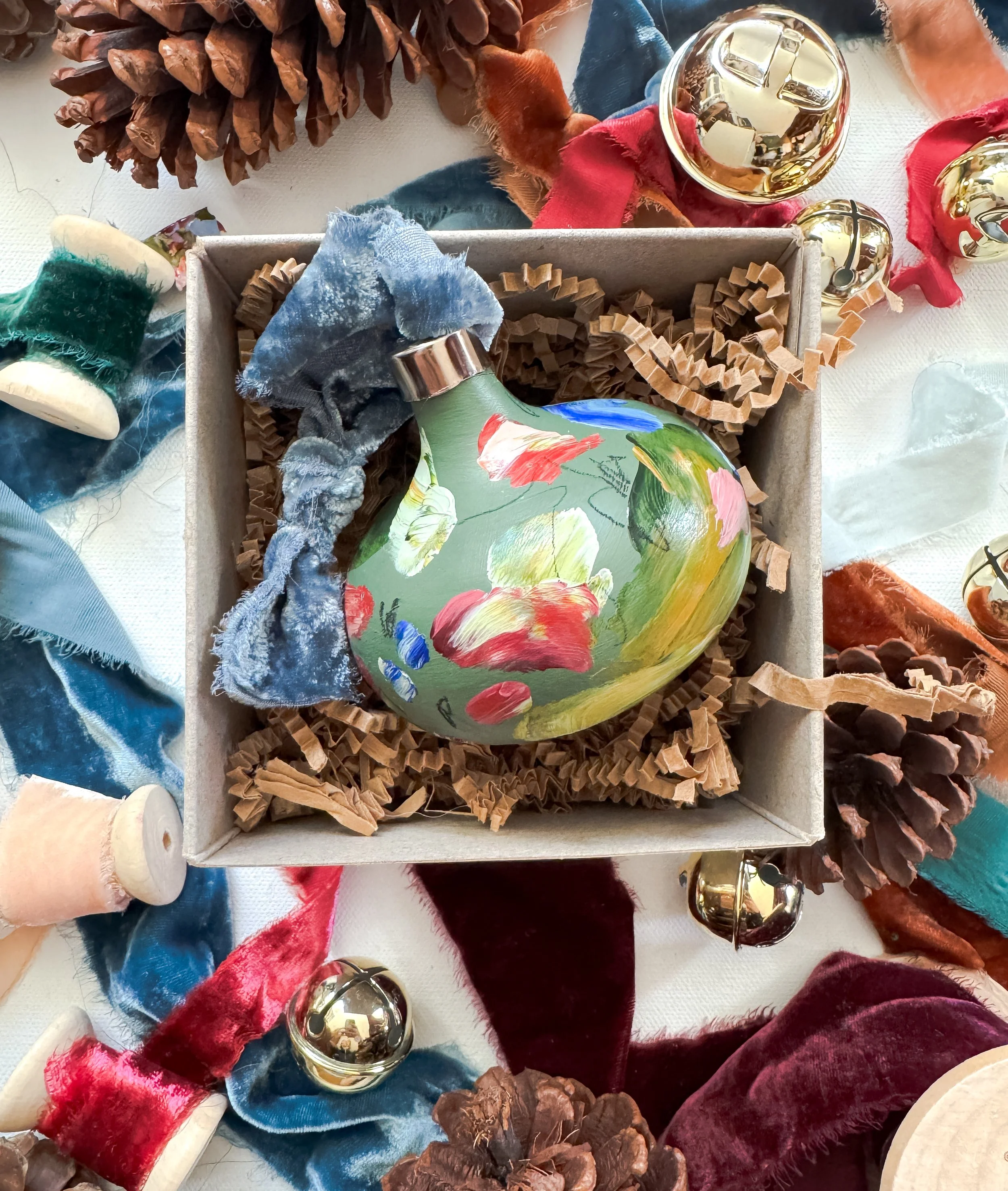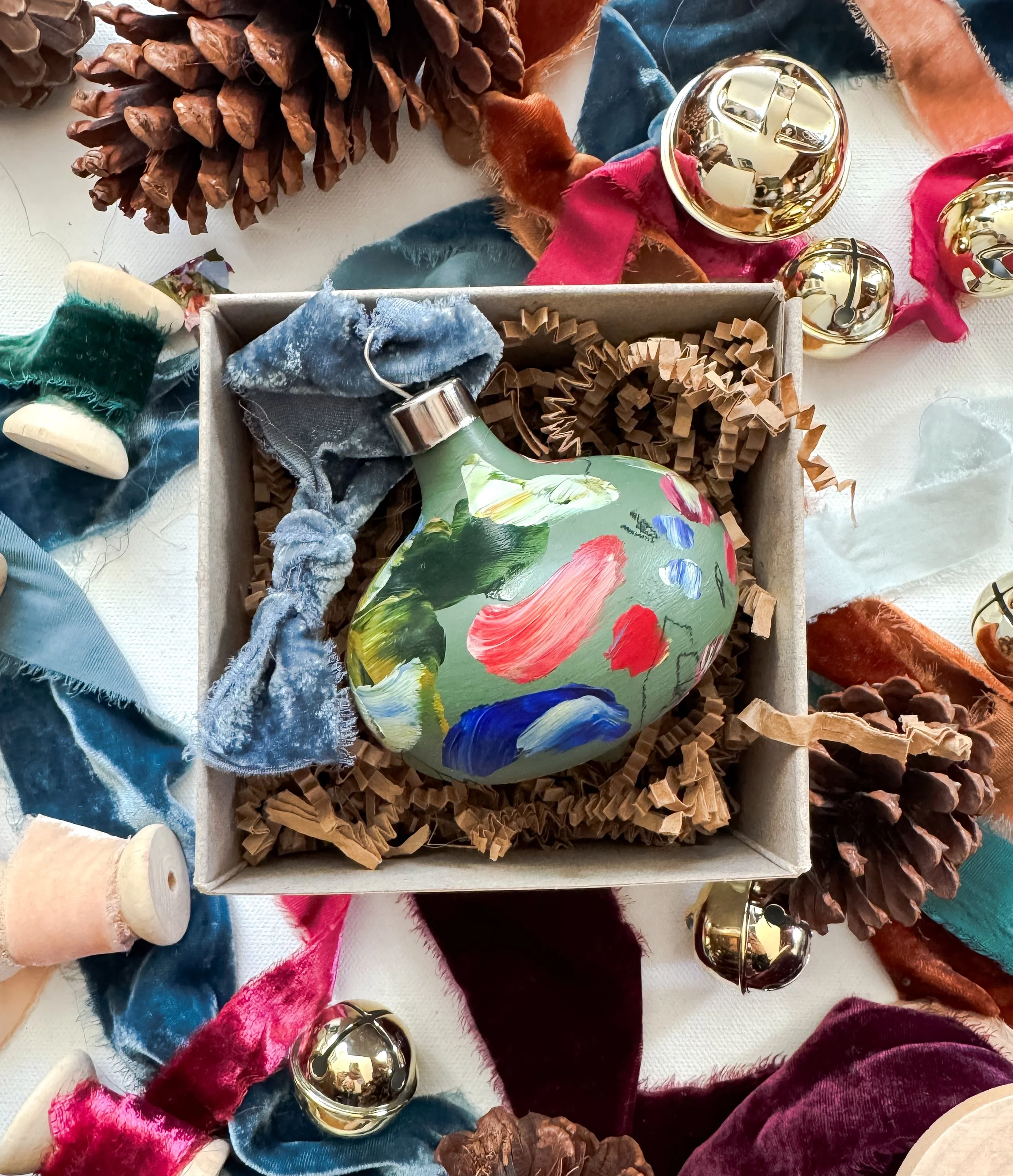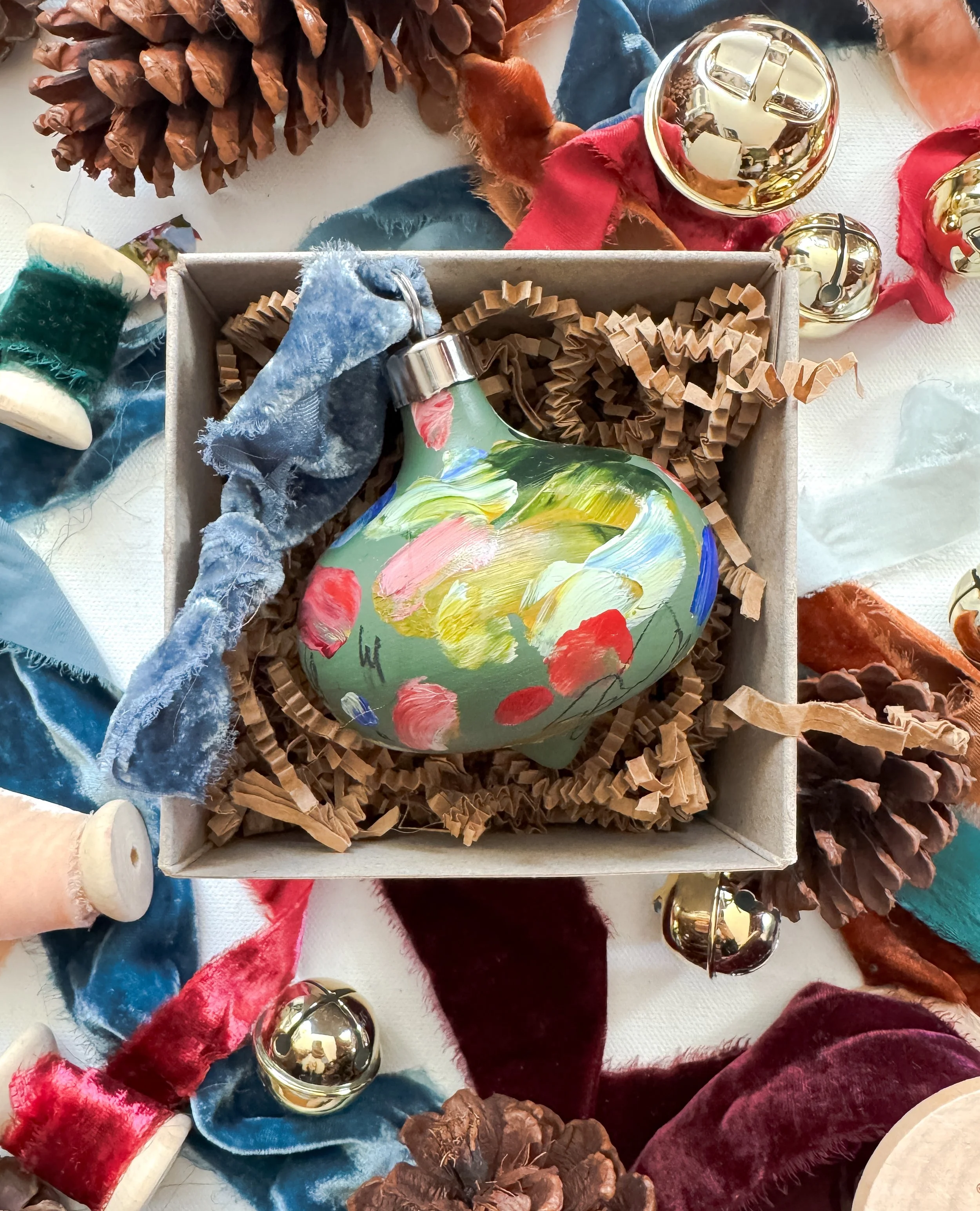 Each ornament is uniquely painted on a muted teal background with pops and swirls of bold colors for a modern influence and finished with hand-dyed, hand-torn velvet ribbon that make them perfect for adorning your holiday tree or as a thoughtful gift.