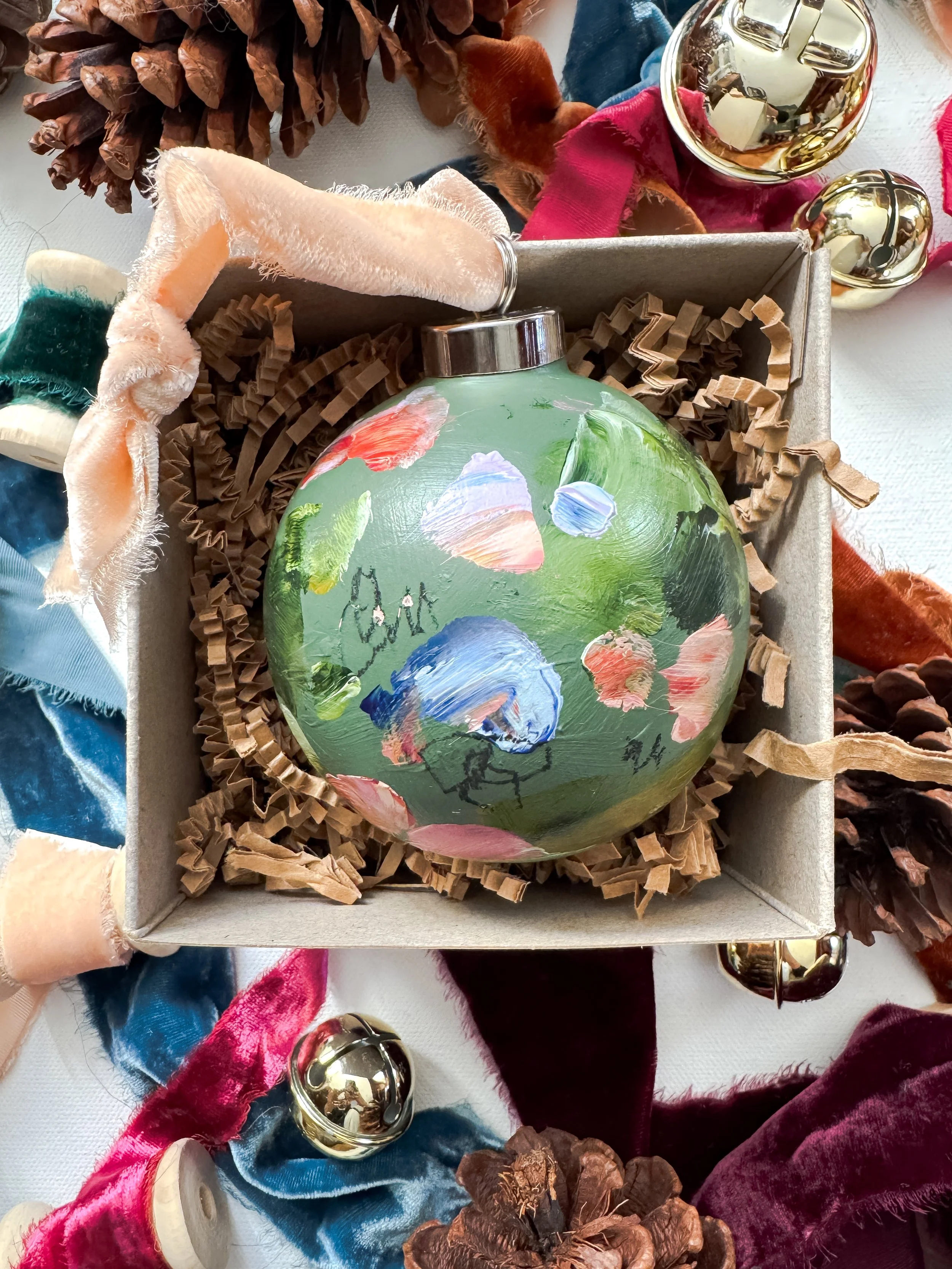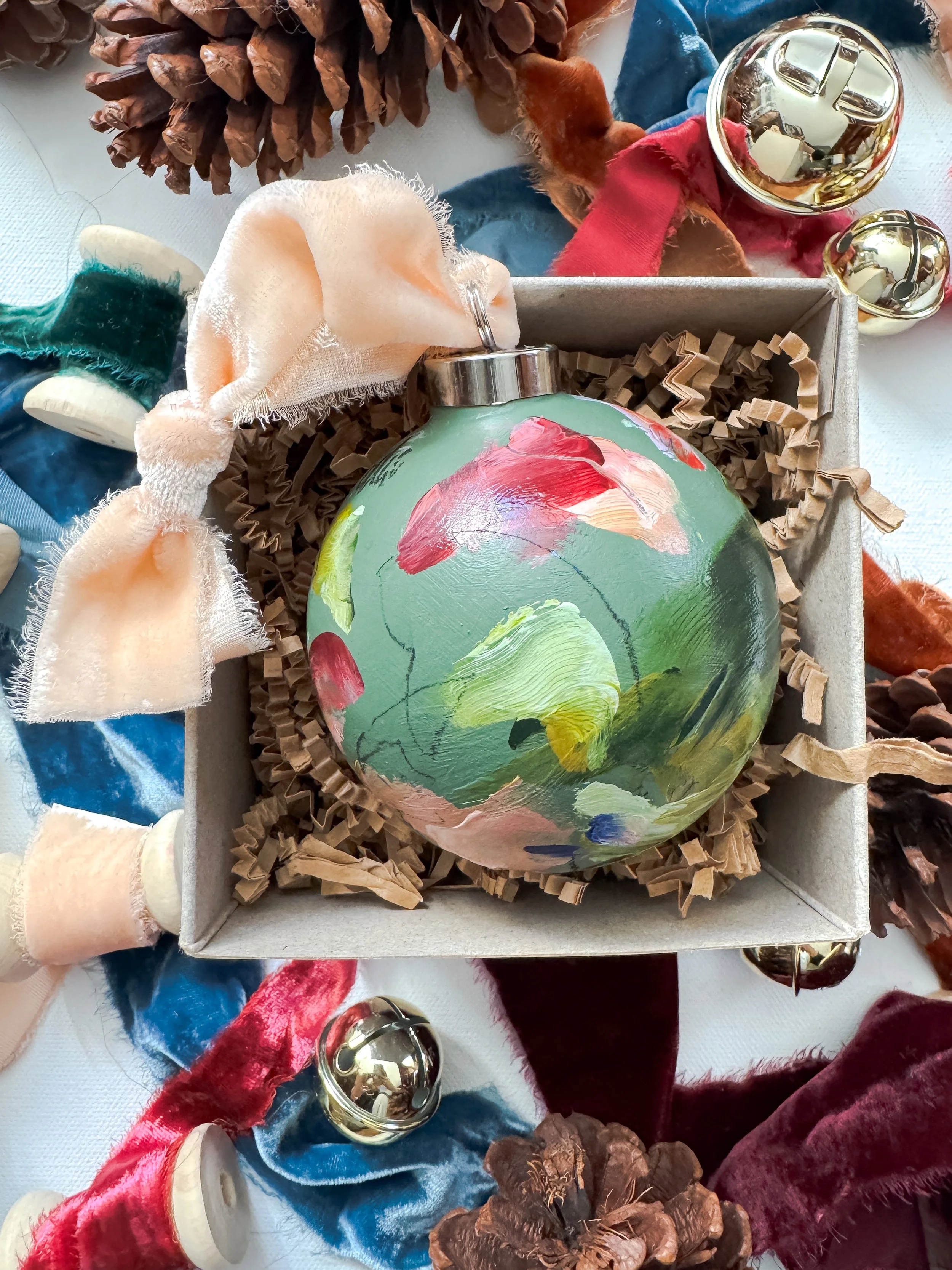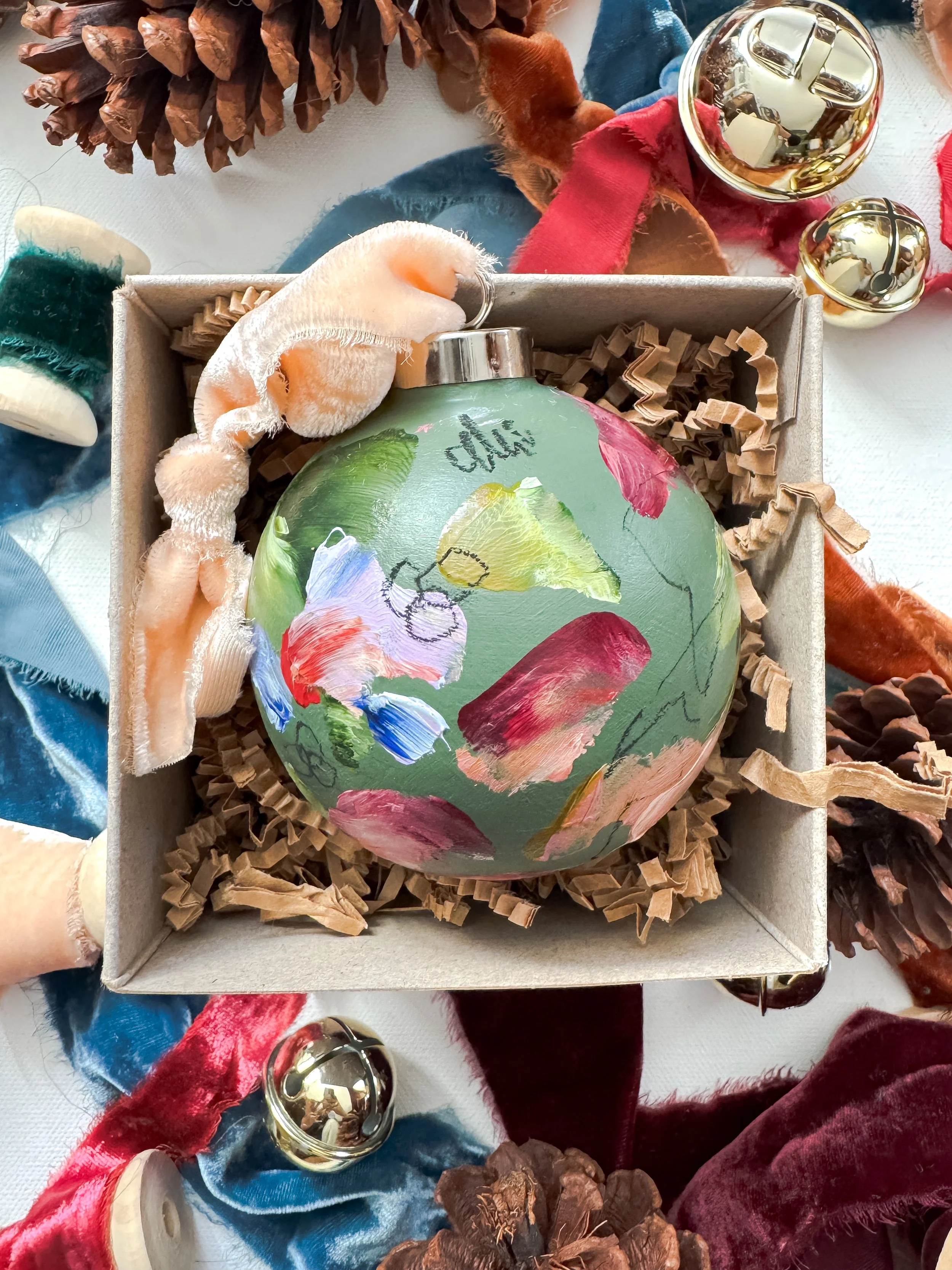 Each ornament is uniquely painted on a muted teal background with pops and swirls of bold colors for a modern influence and finished with hand-dyed, hand-torn velvet ribbon that make them perfect for adorning your holiday tree or as a thoughtful gift.