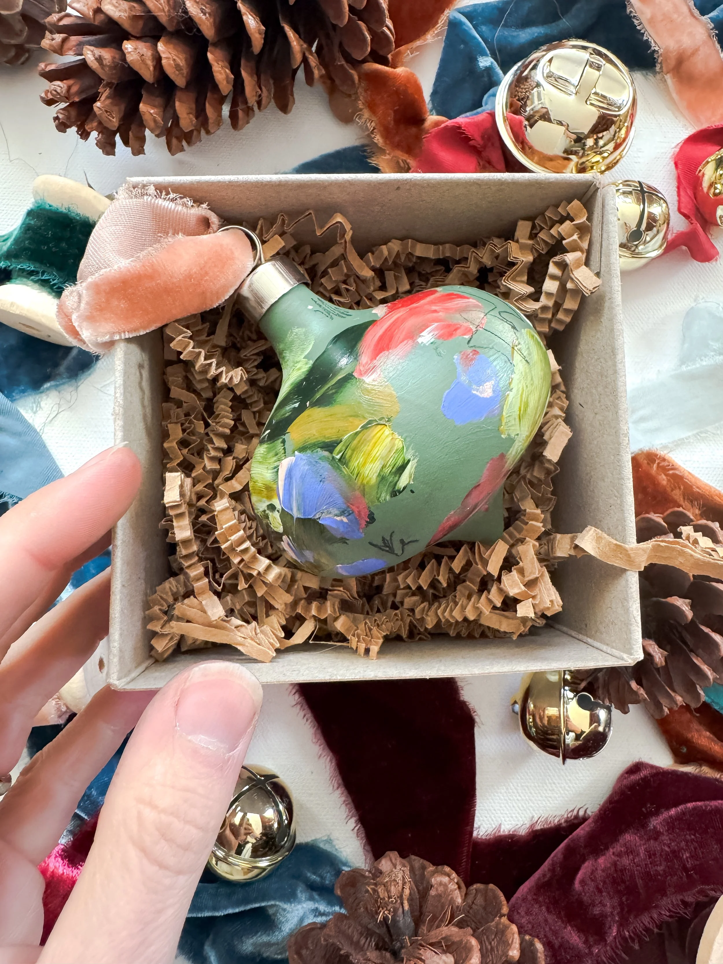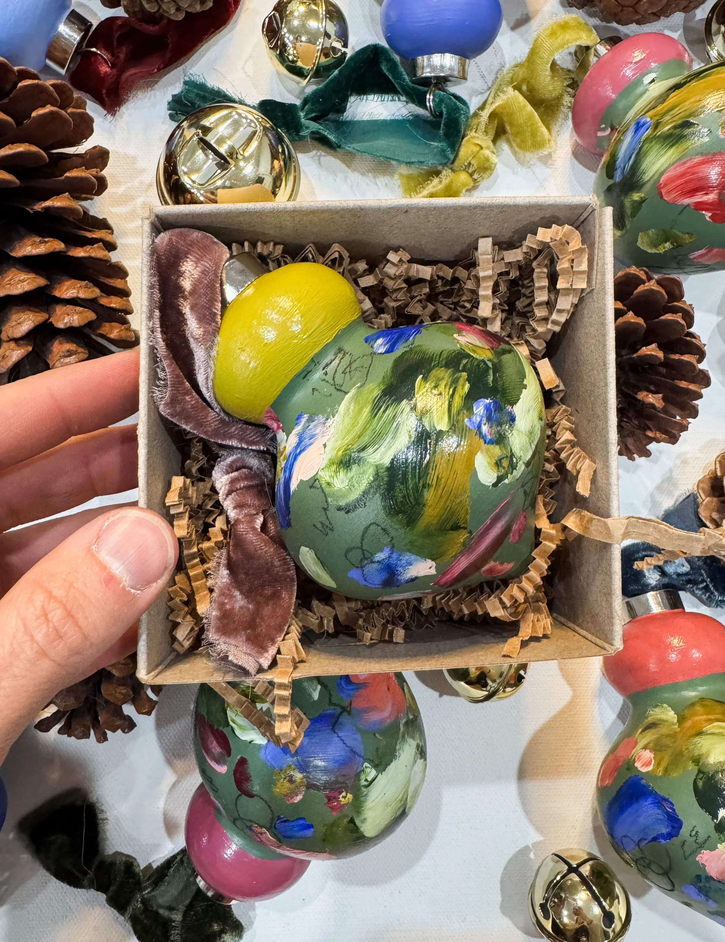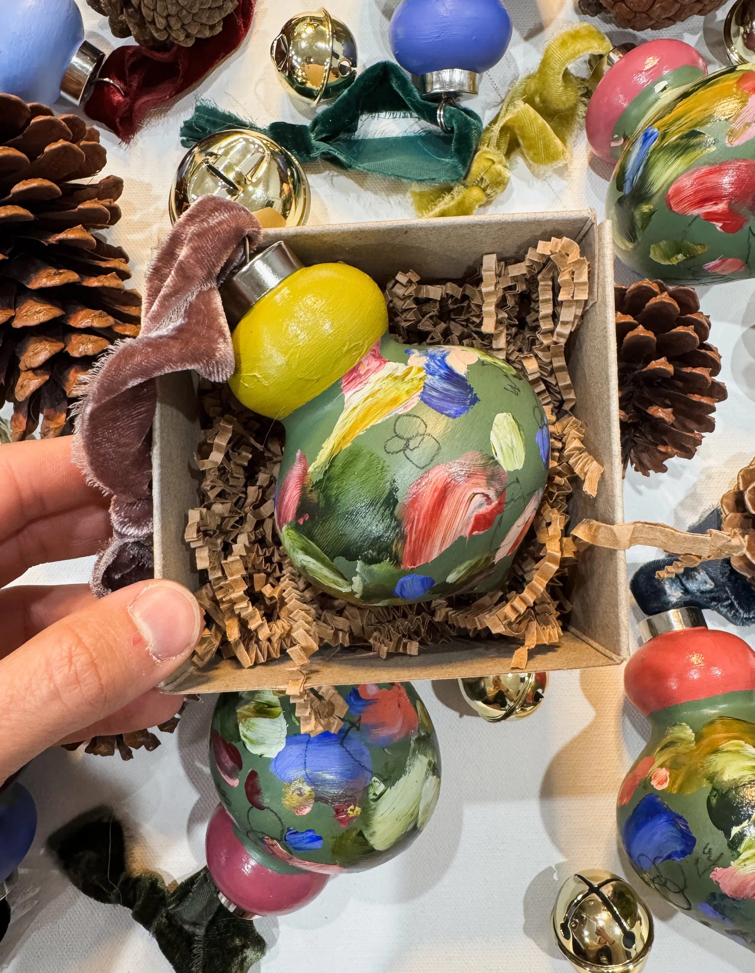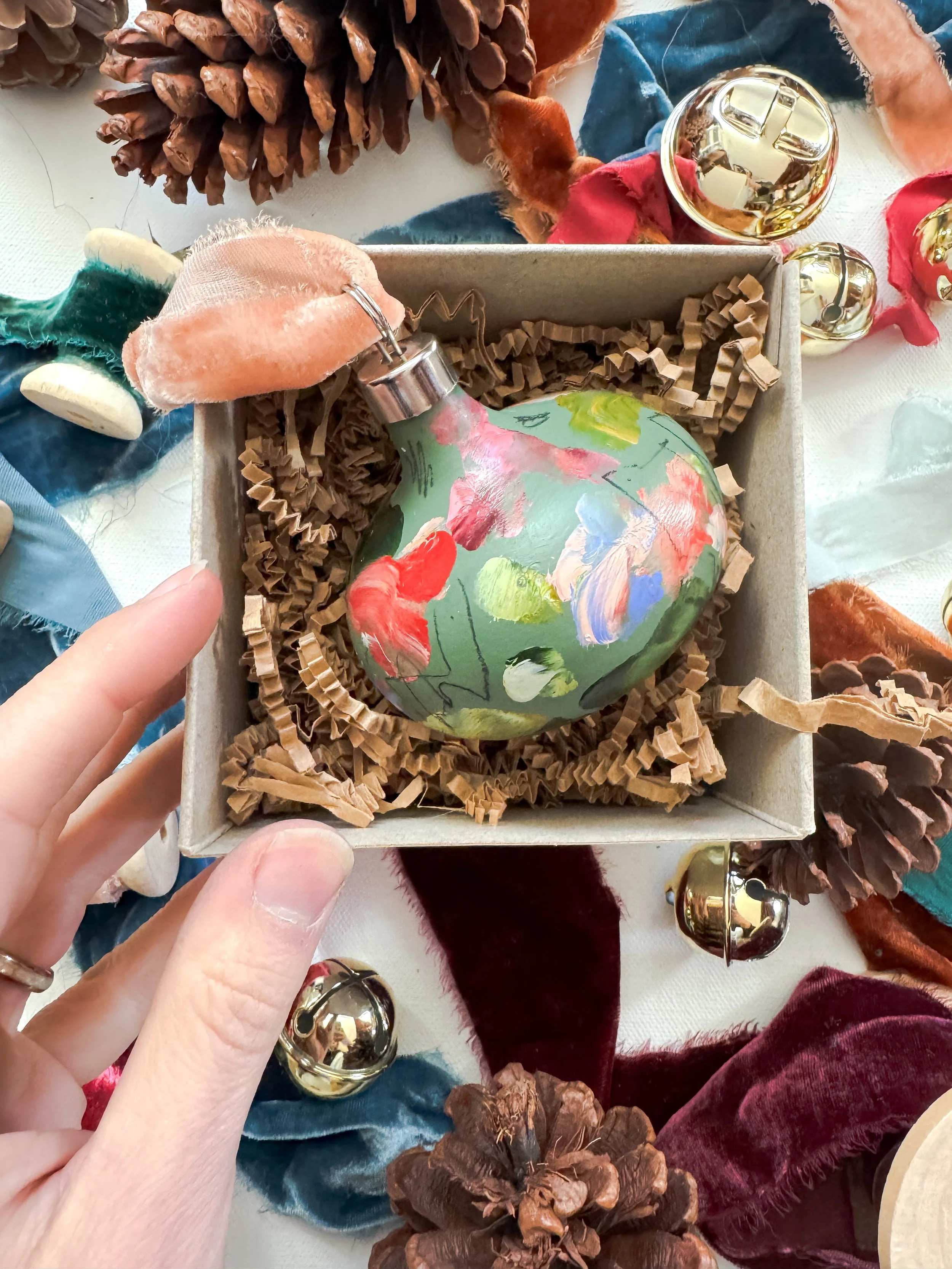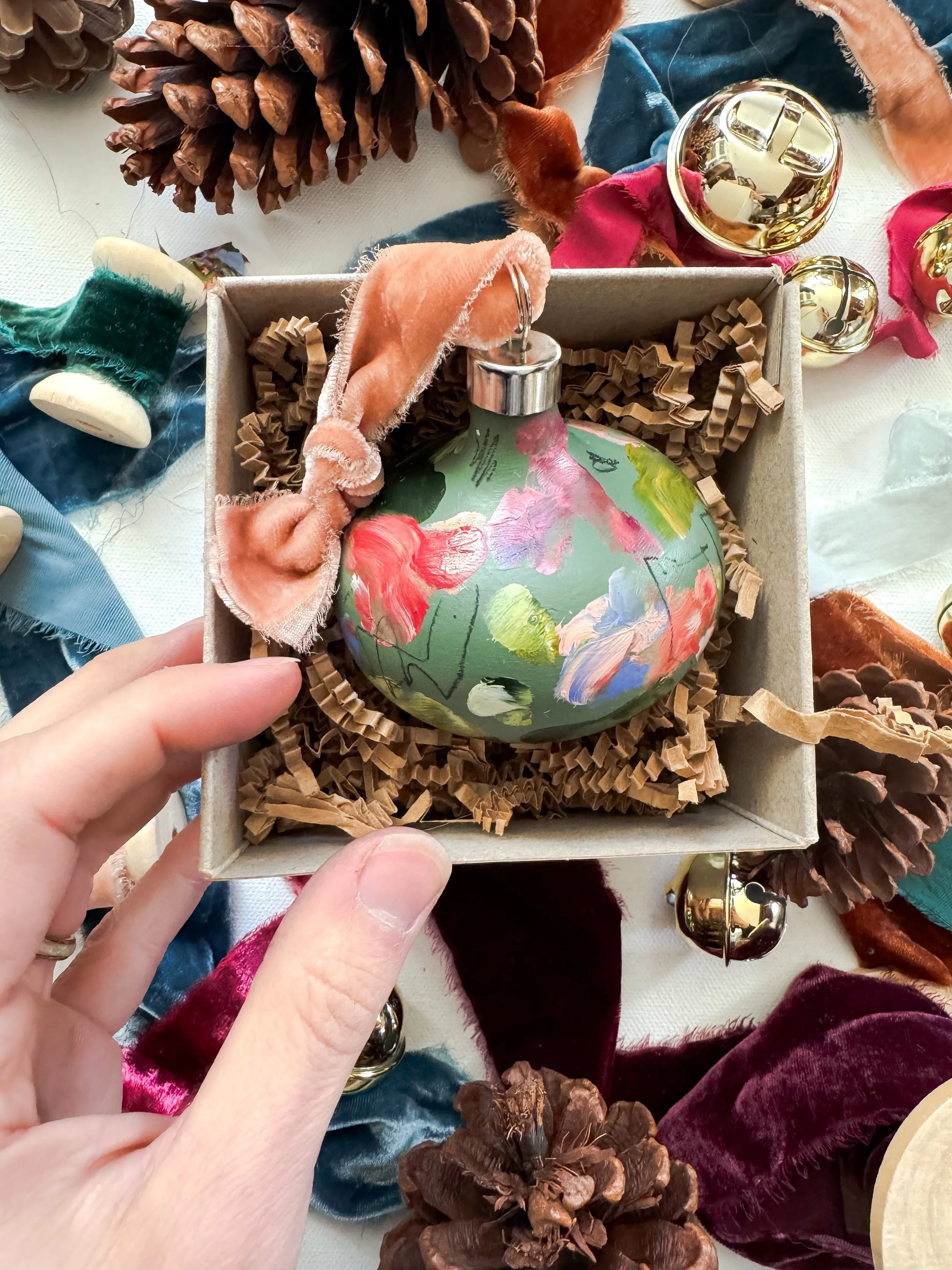 Each ornament is uniquely painted on a muted teal background with pops and swirls of bold colors for a modern influence and finished with hand-dyed, hand-torn velvet ribbon that make them perfect for adorning your holiday tree or as a thoughtful gift.
