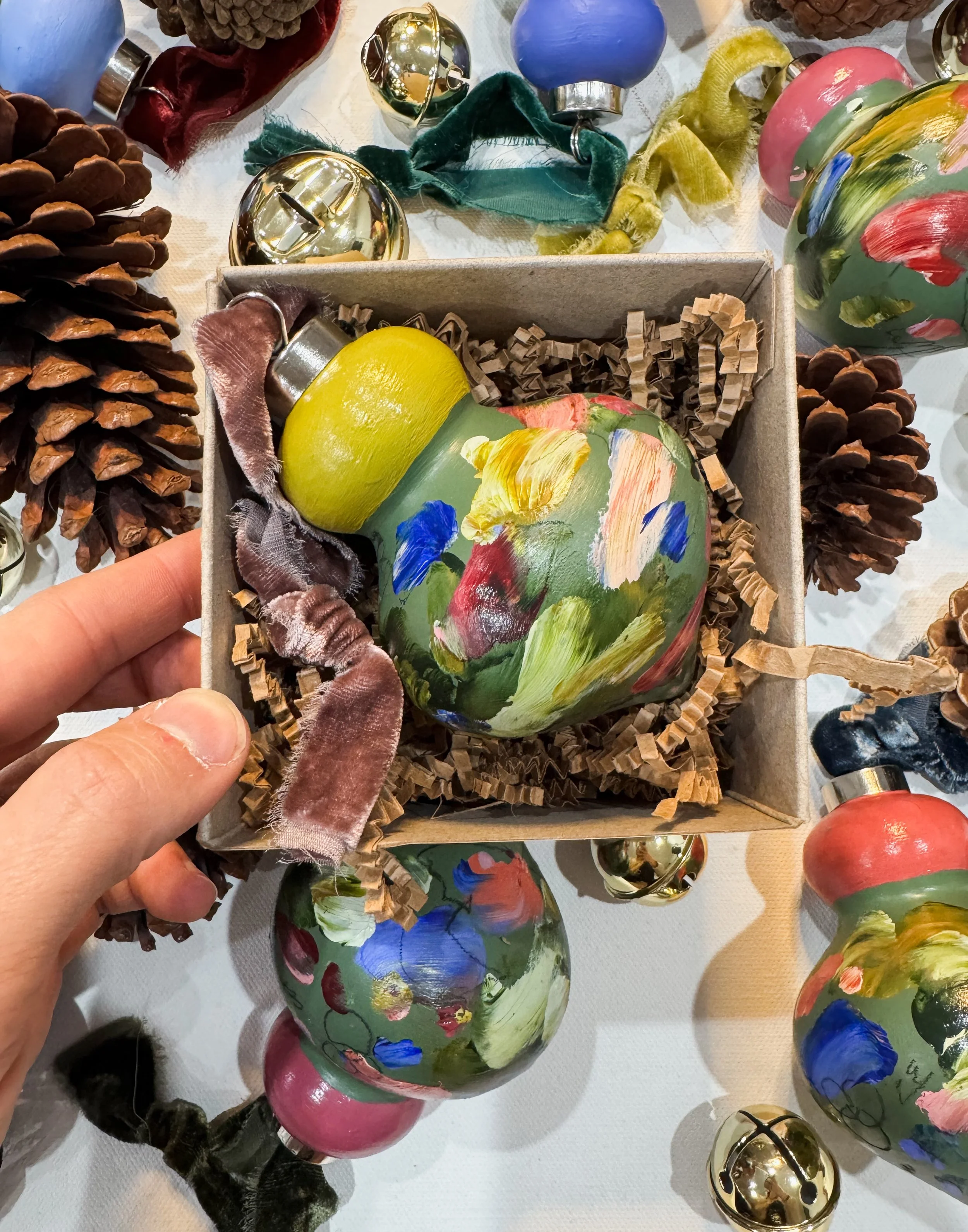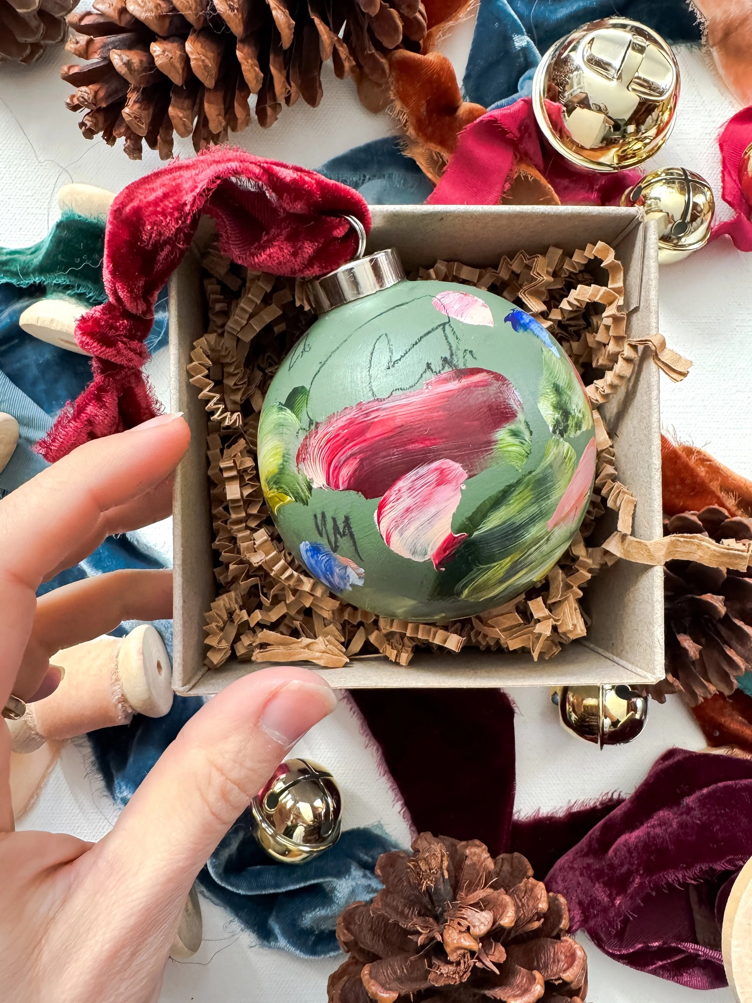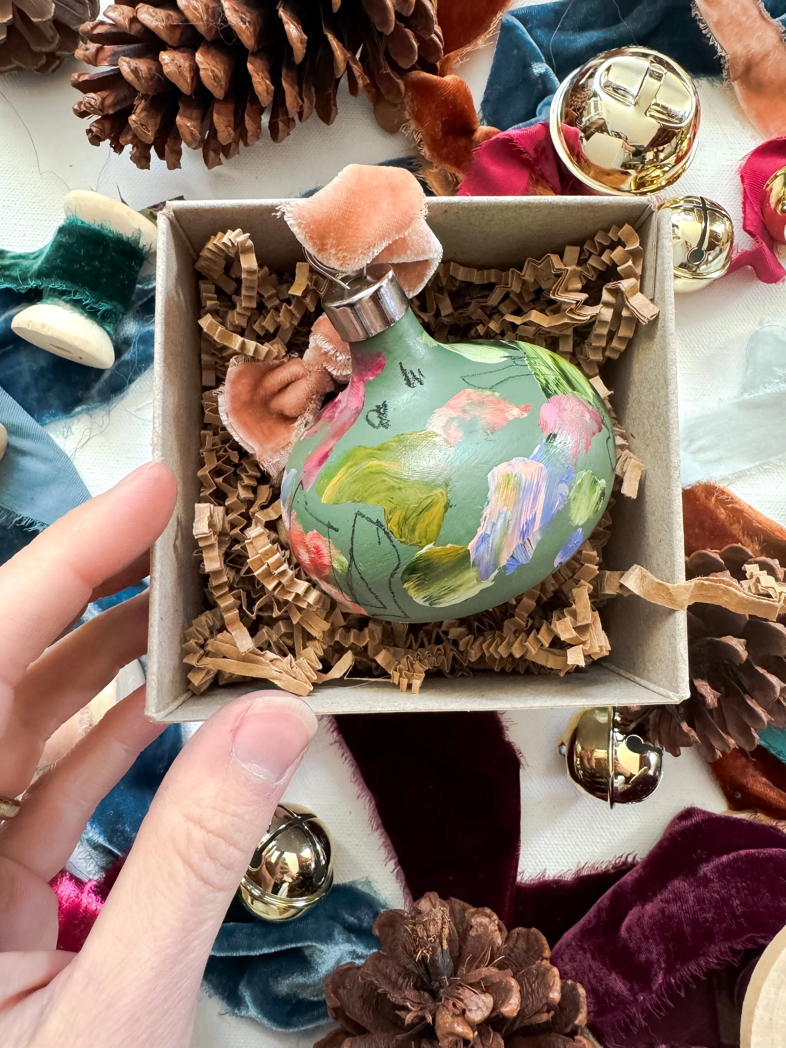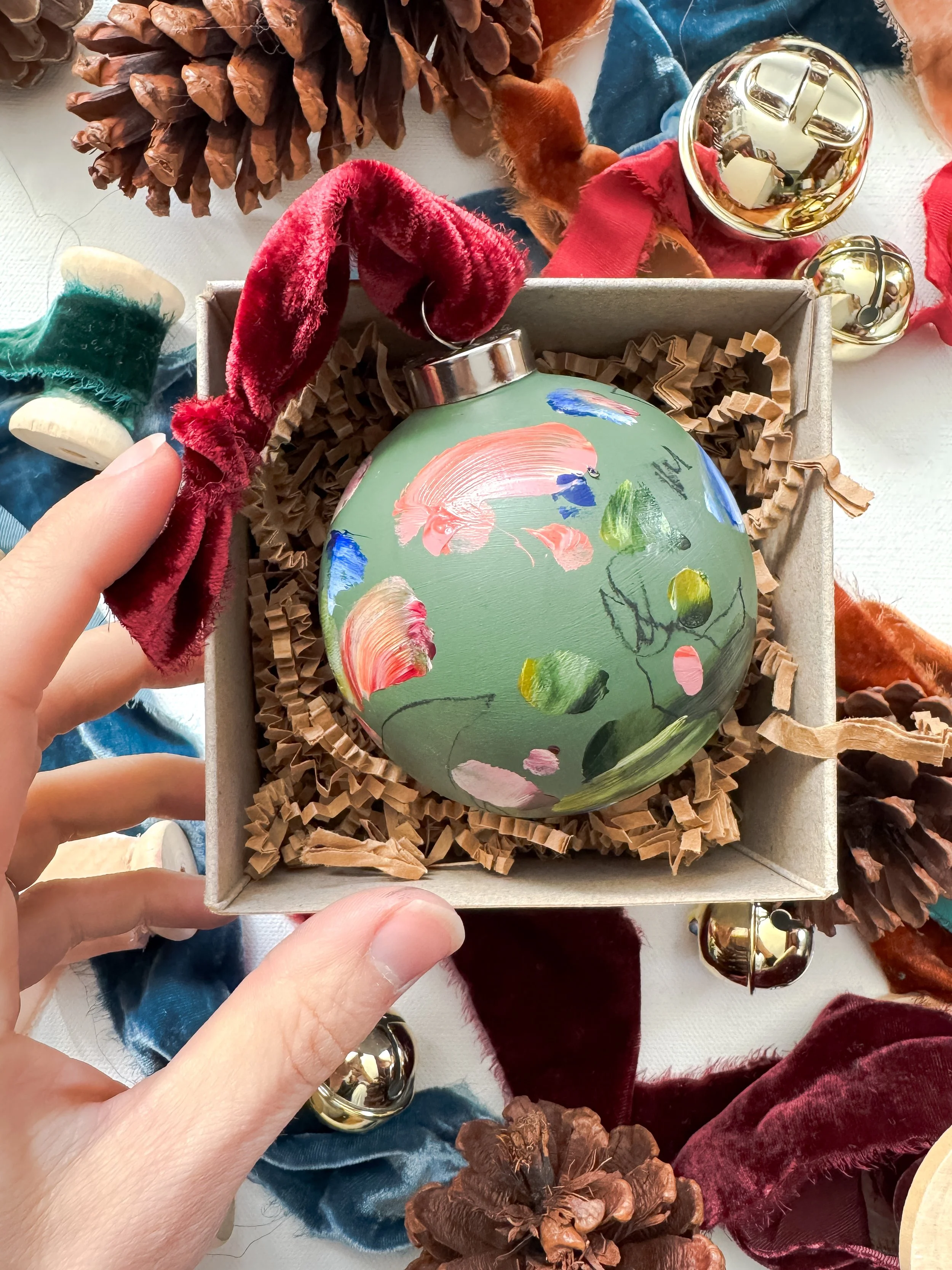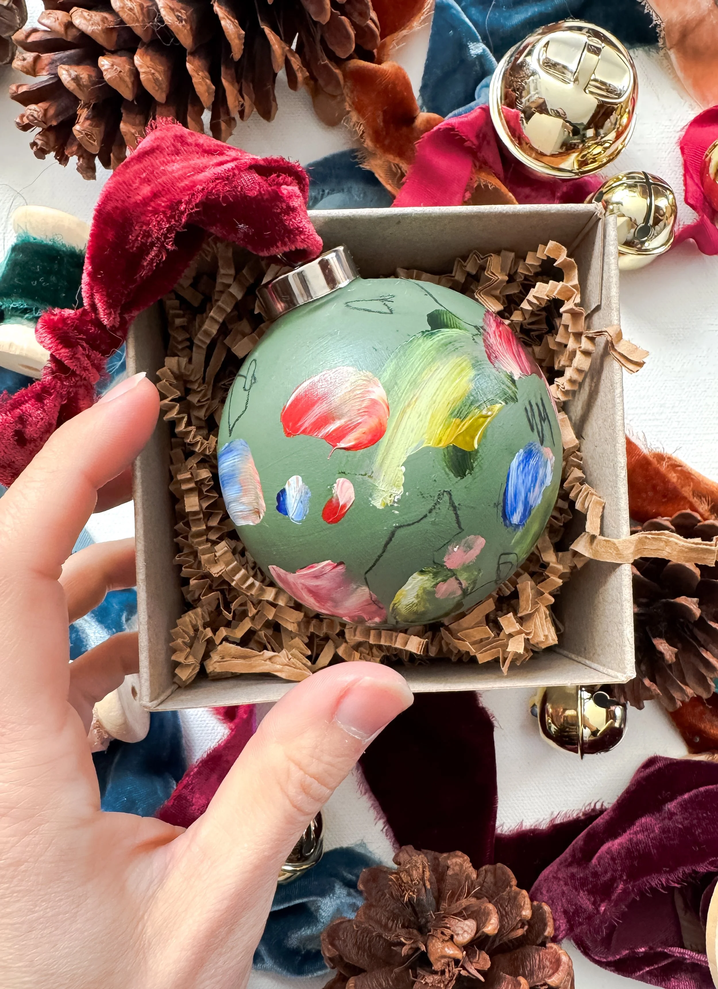 Each ornament is uniquely painted on a muted teal background with pops and swirls of bold colors for a modern influence and finished with hand-dyed, hand-torn velvet ribbon that make them perfect for adorning your holiday tree or as a thoughtful gift.