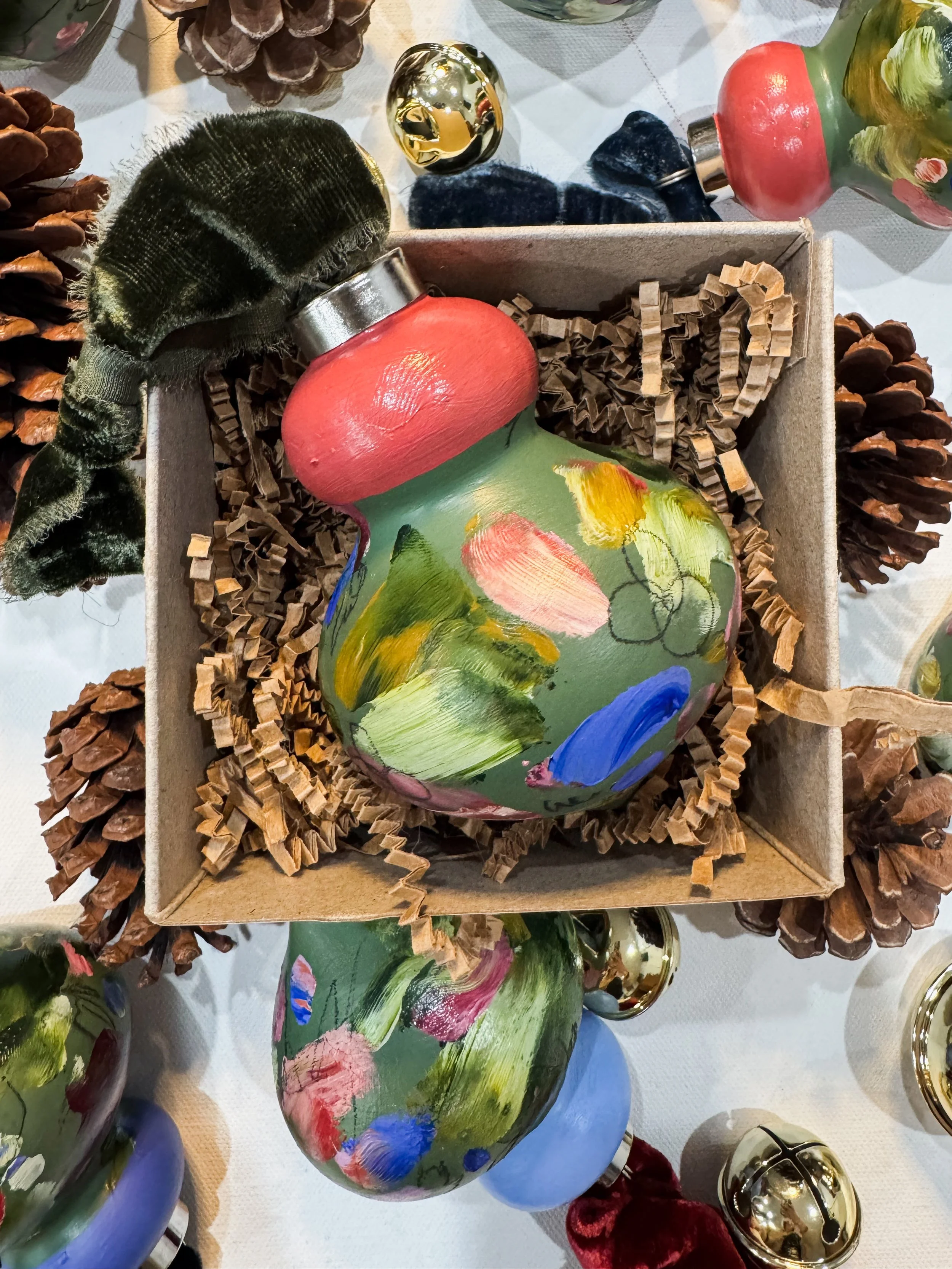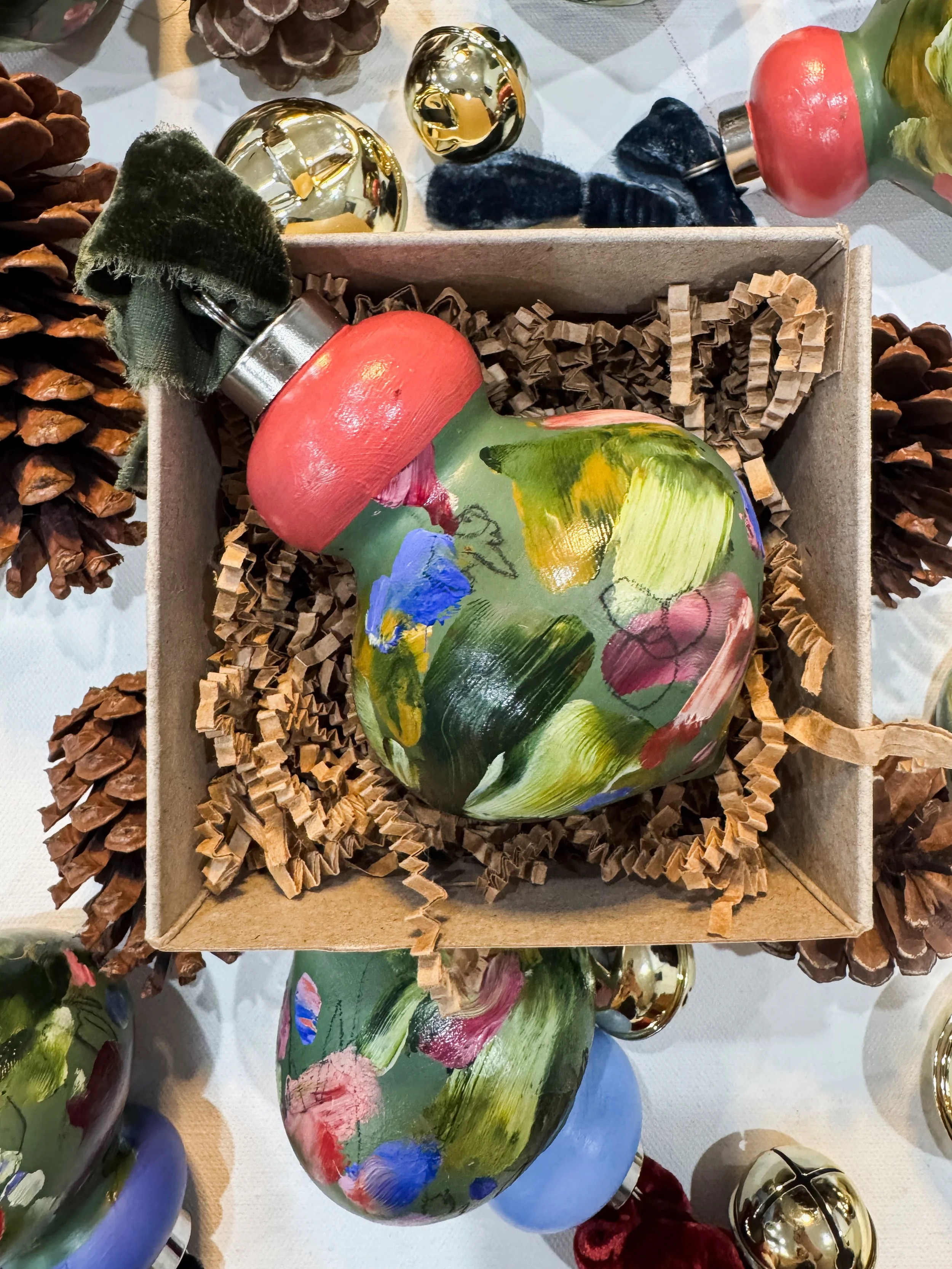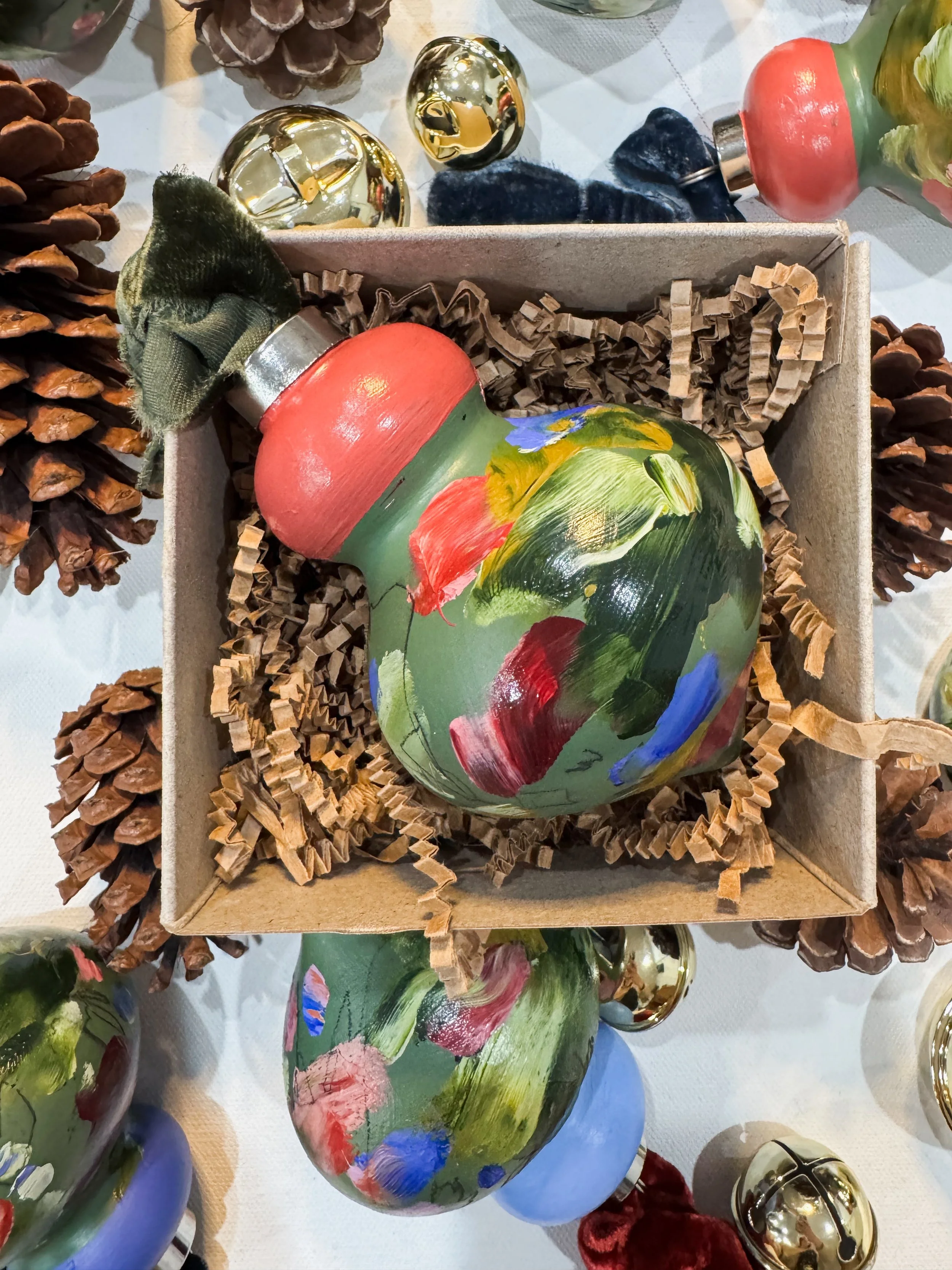 2025 “Touched” hand-painted, abstract holiday ornaments inspired by images of fuzzy bees covered in pollen and nectar visiting flower to flower, pollinating them in the process, and the beauty that is multiplied thereafter - by abstract artist, Marcy Parks.