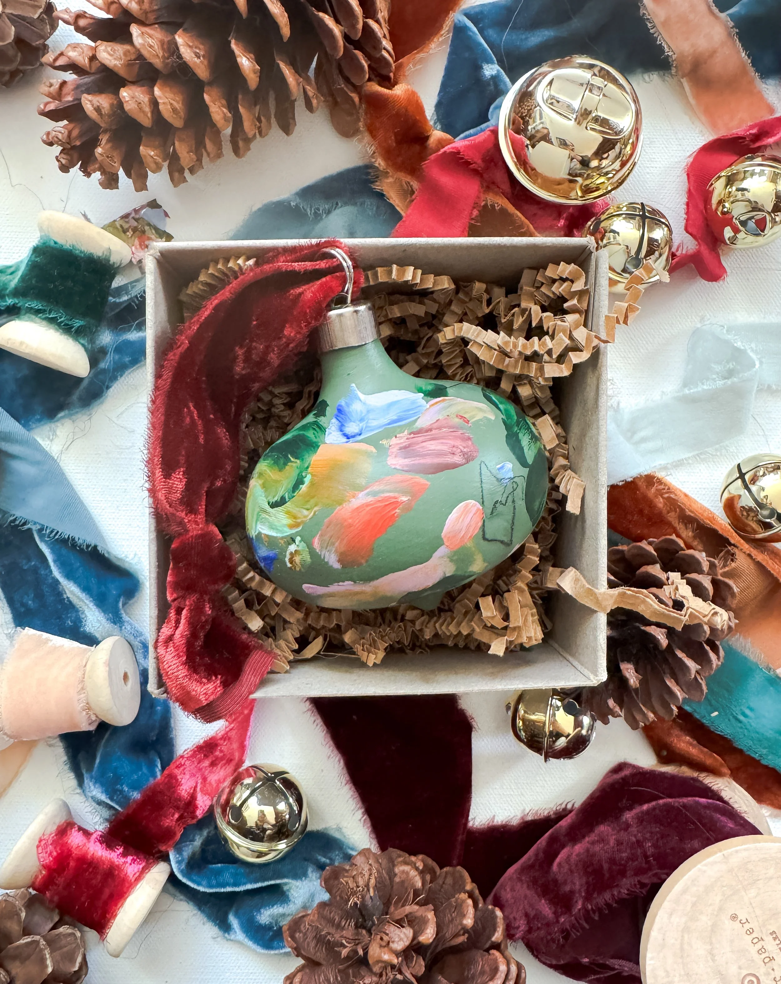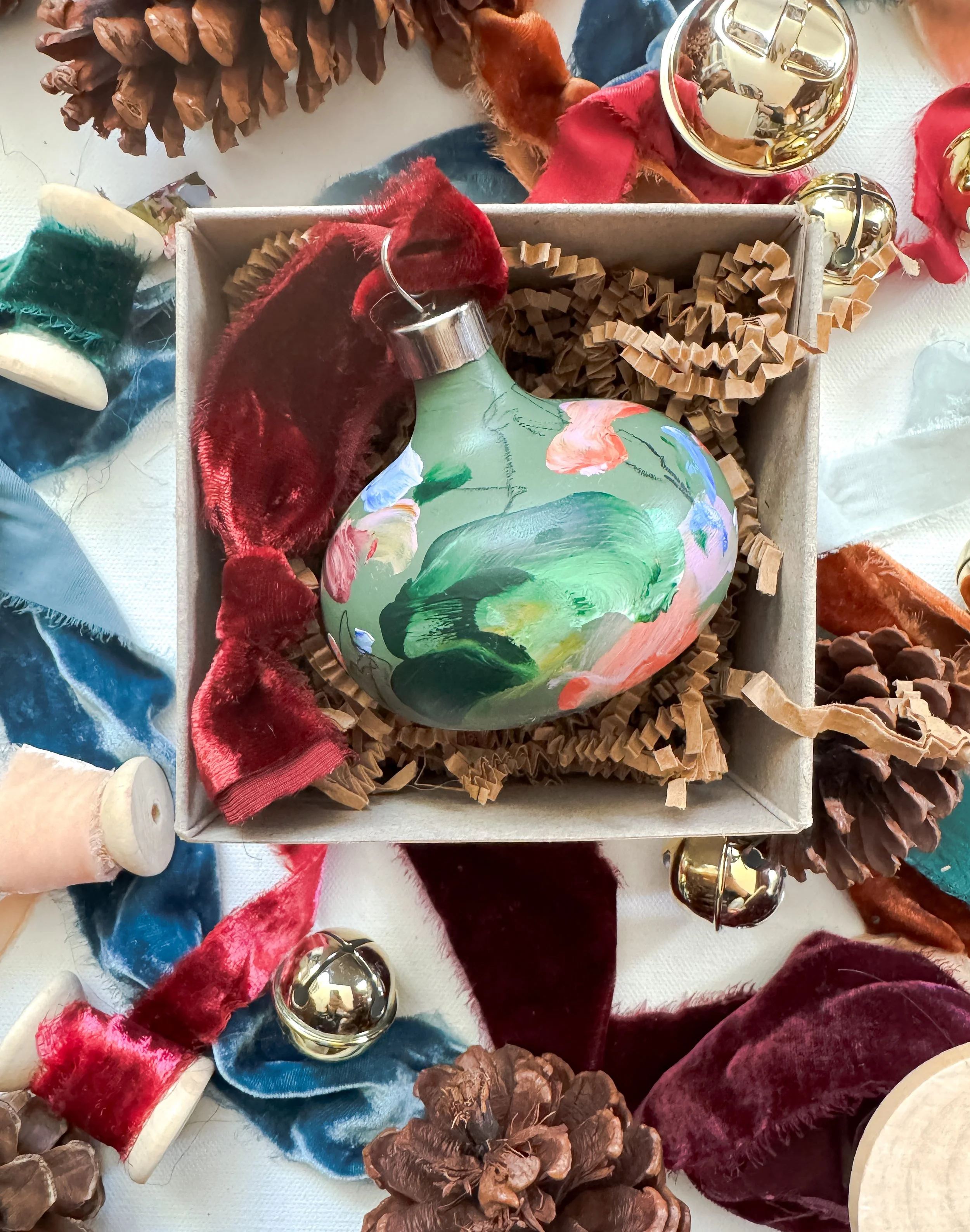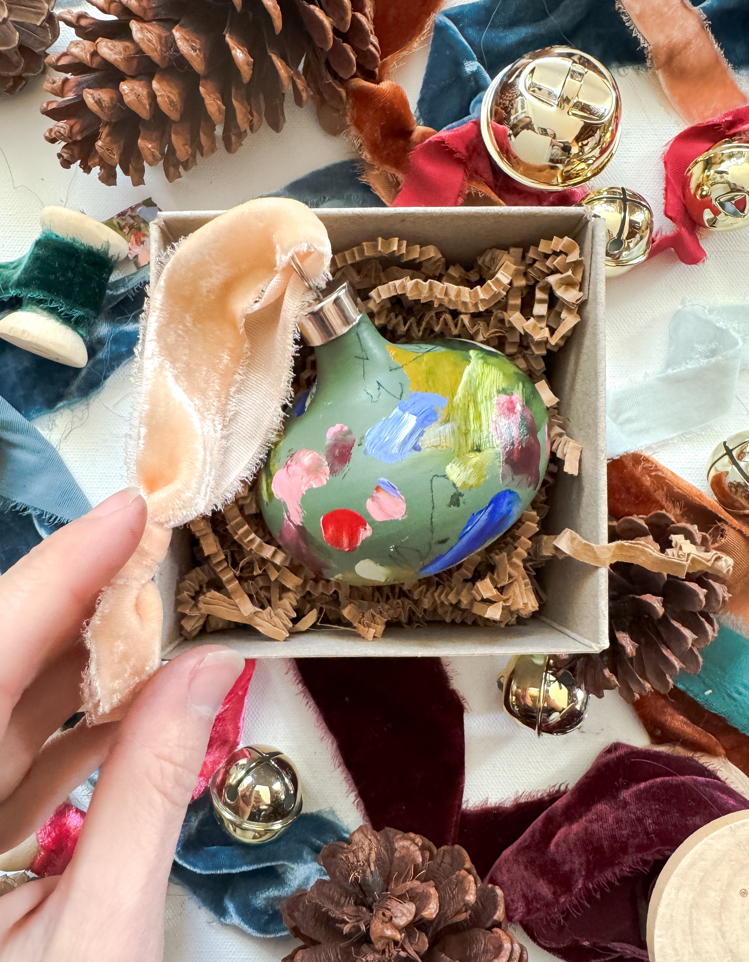 Each ornament is uniquely painted on a muted teal background with pops and swirls of bold colors for a modern influence and finished with hand-dyed, hand-torn velvet ribbon that make them perfect for adorning your holiday tree or as a thoughtful gift.
