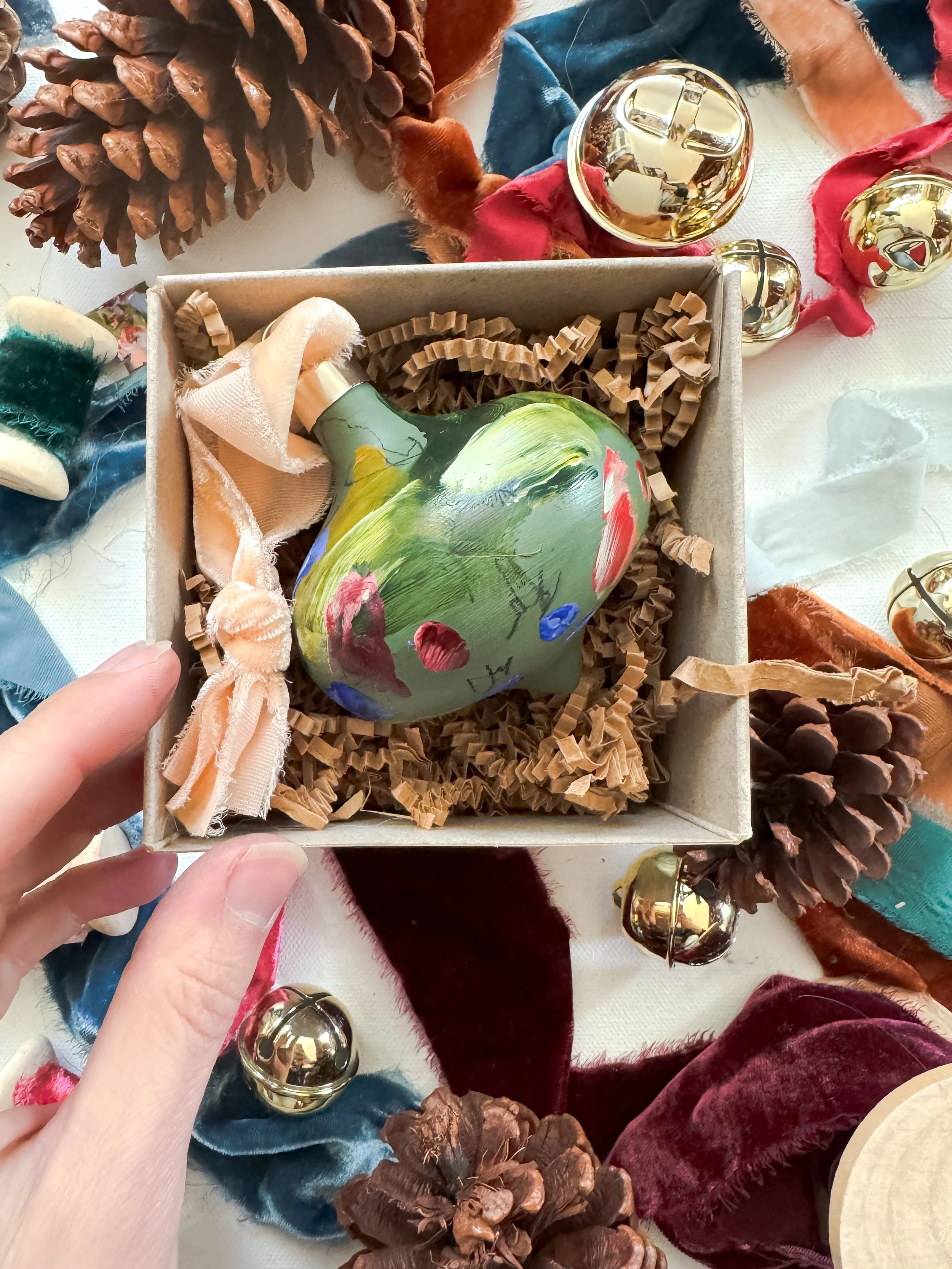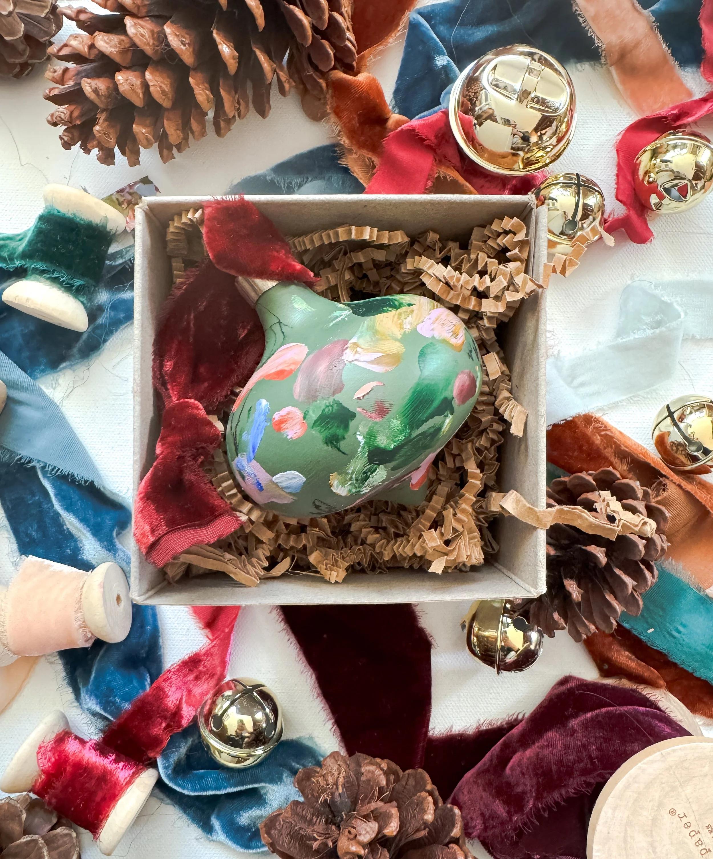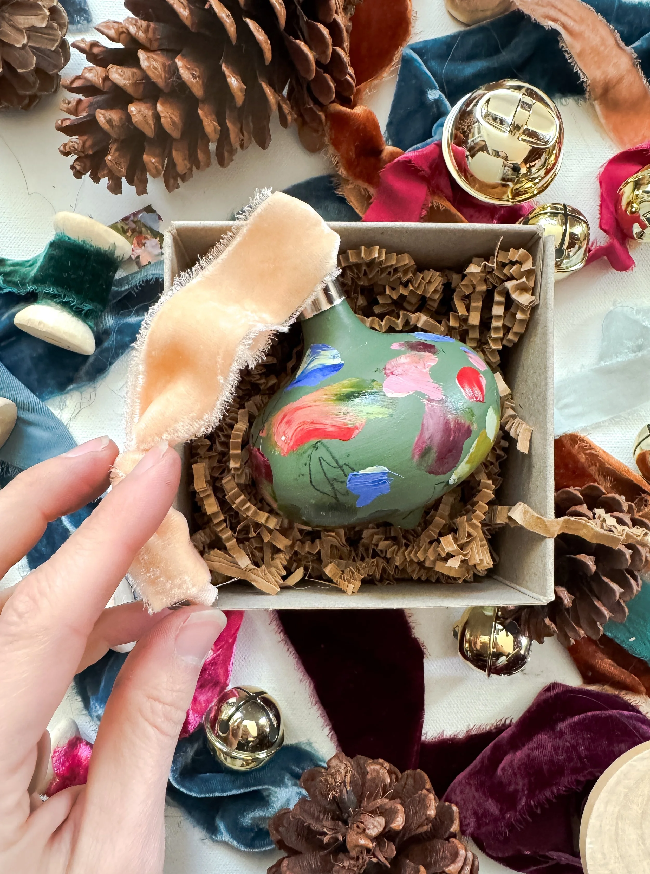 Each ornament is uniquely painted on a muted teal background with pops and swirls of bold colors for a modern influence and finished with hand-dyed, hand-torn velvet ribbon that make them perfect for adorning your holiday tree or as a thoughtful gift.