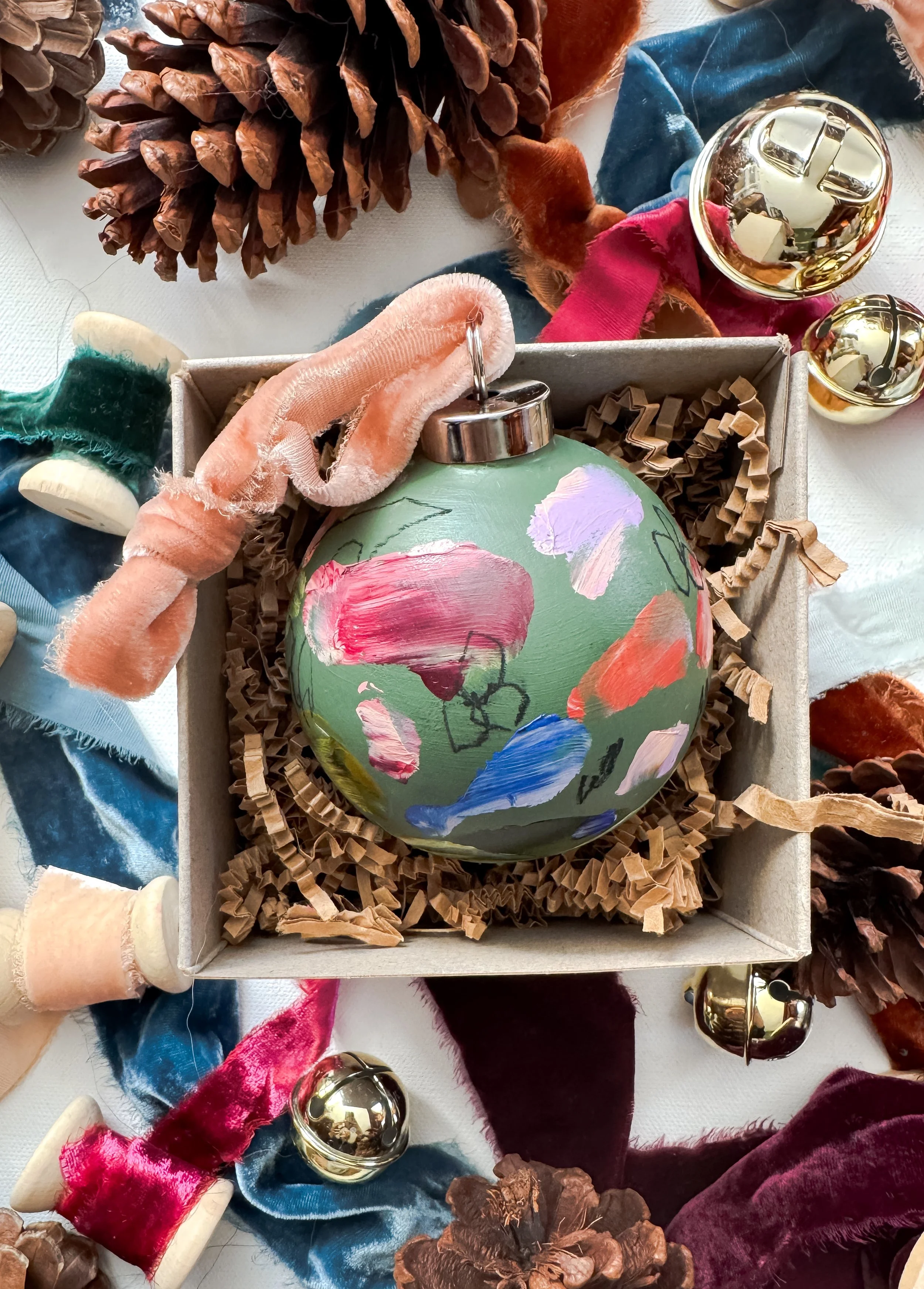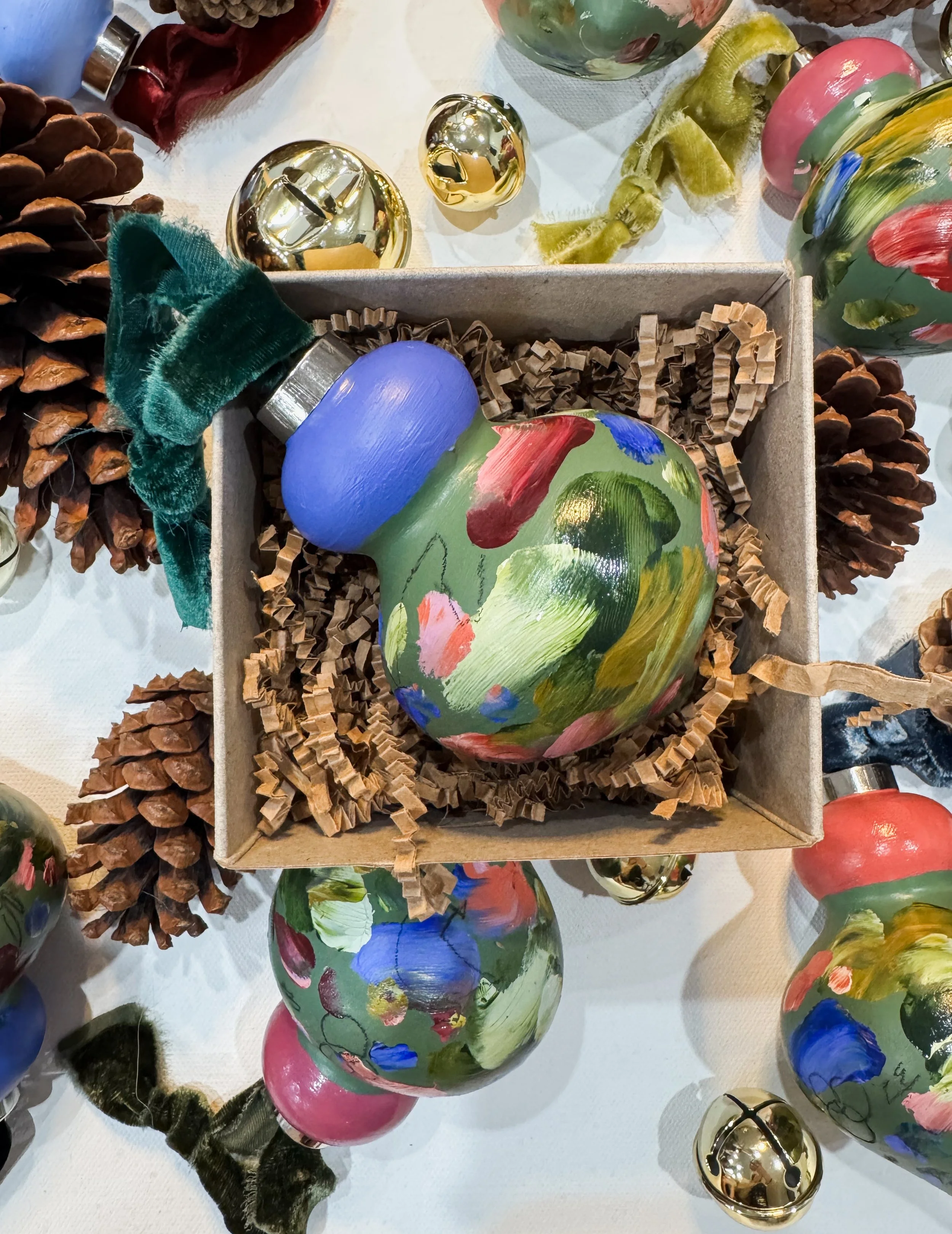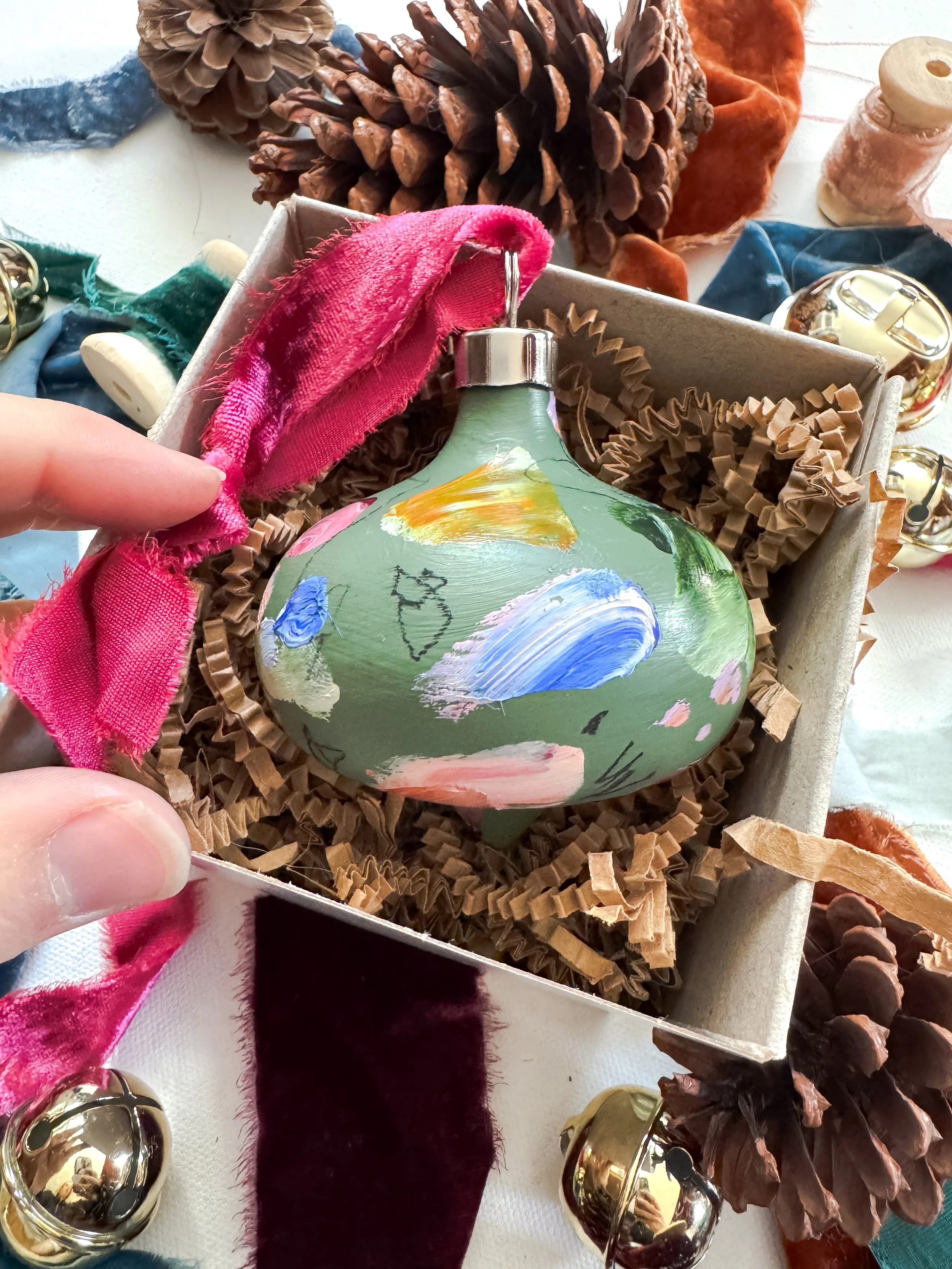 Each ornament is uniquely painted on a muted teal background with pops and swirls of bold colors for a modern influence and finished with hand-dyed, hand-torn velvet ribbon that make them perfect for adorning your holiday tree or as a thoughtful gift.