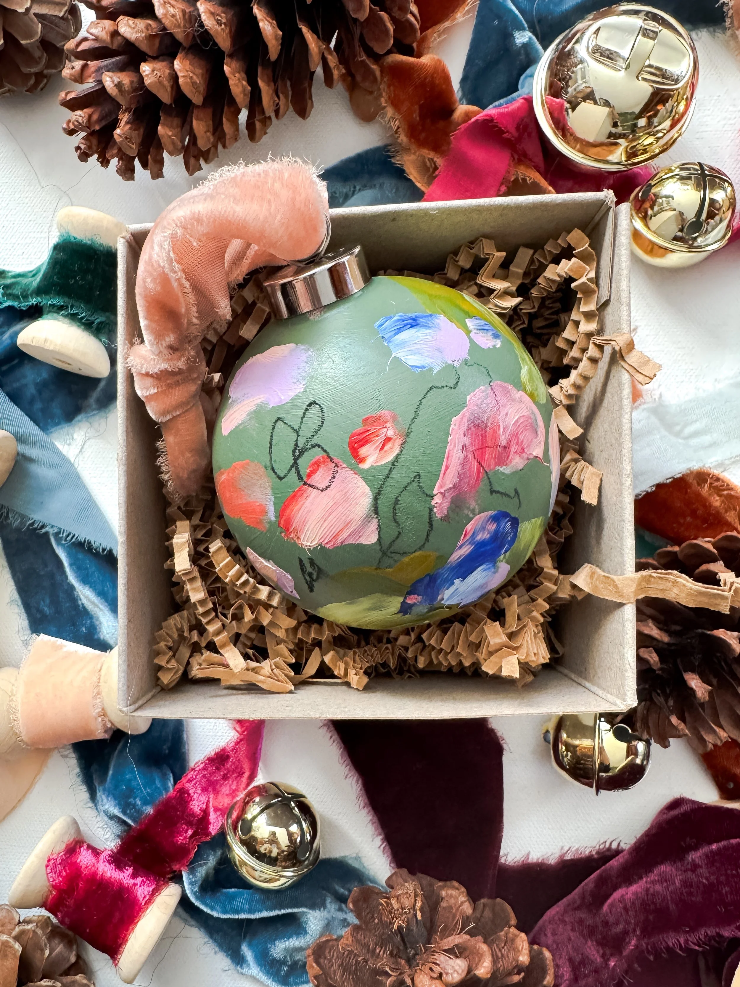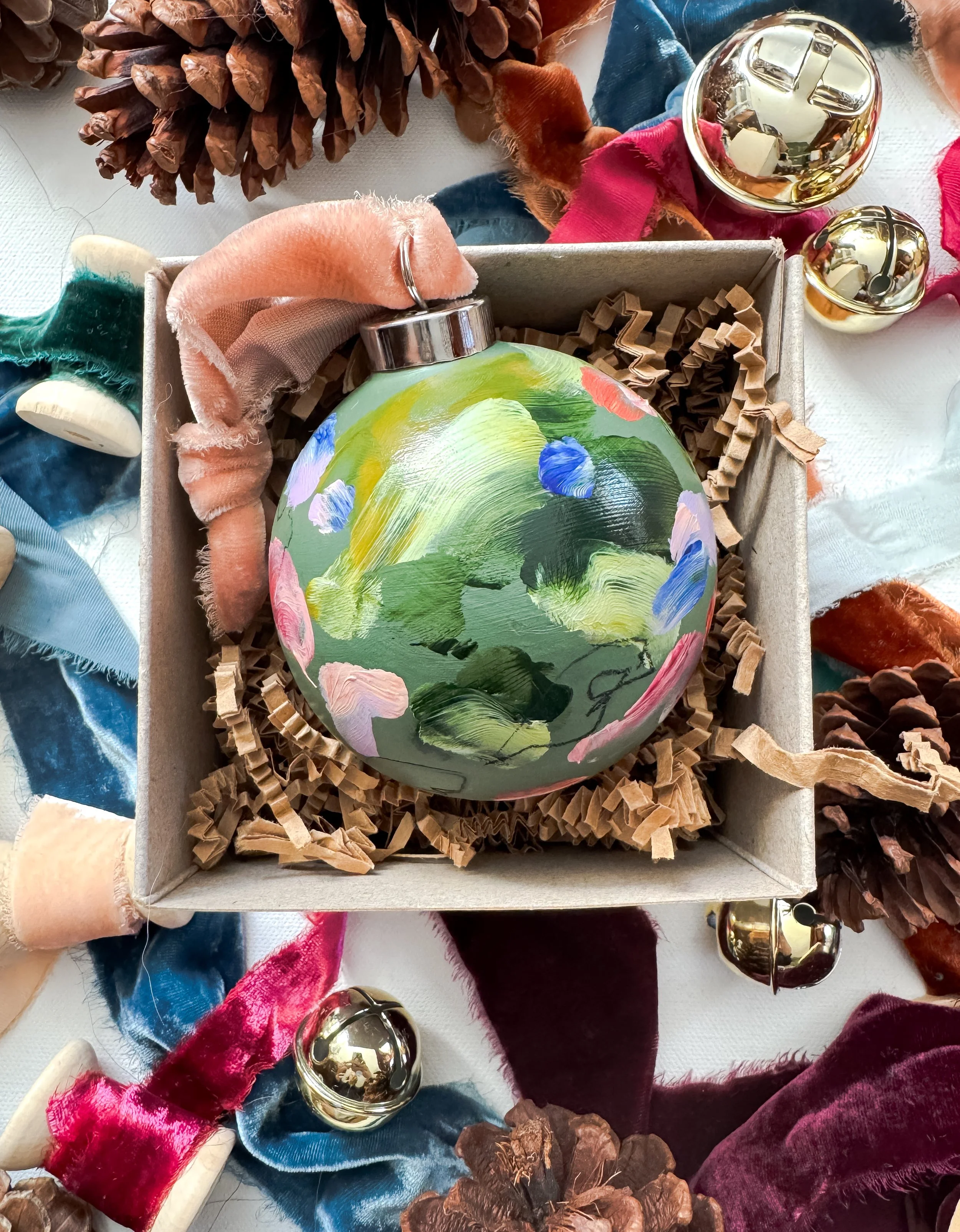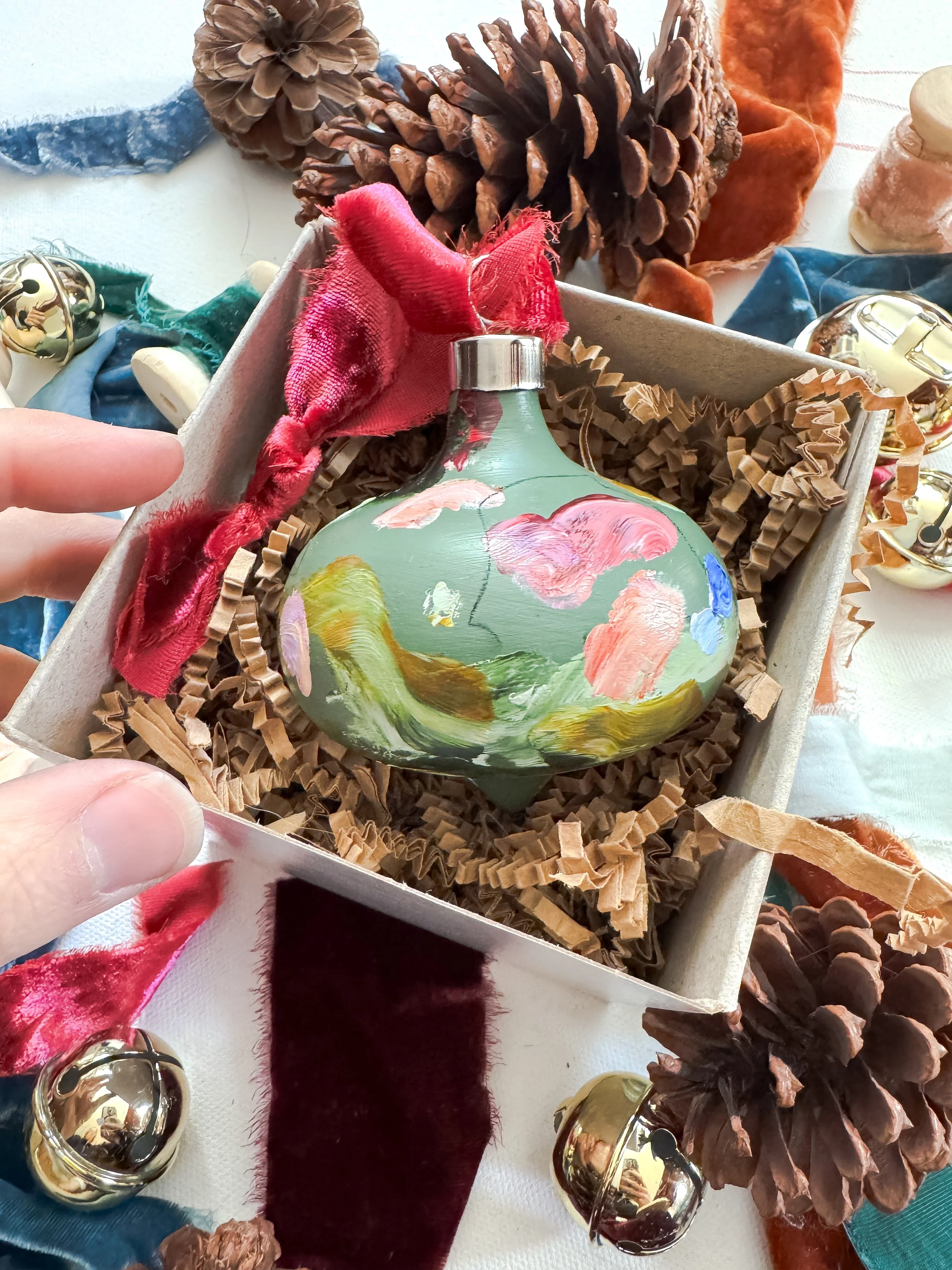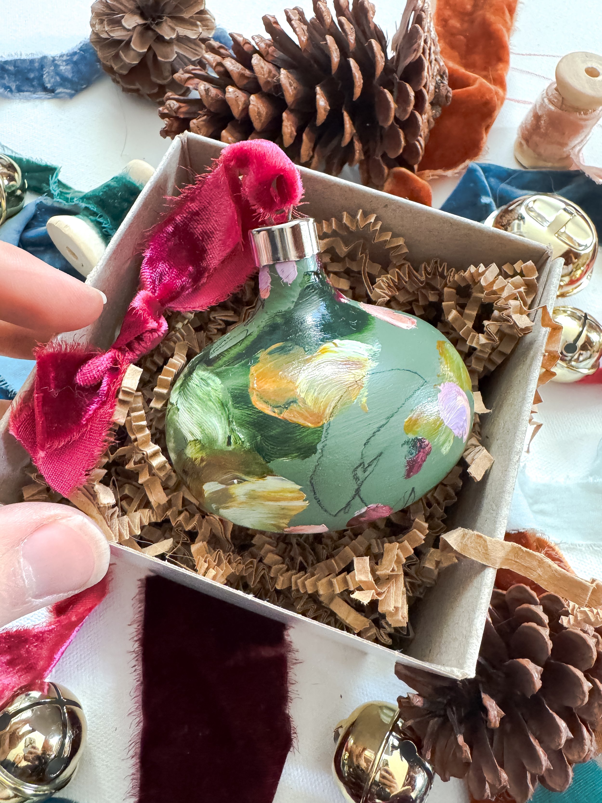 Each ornament is uniquely painted on a muted teal background with pops and swirls of bold colors for a modern influence and finished with hand-dyed, hand-torn velvet ribbon that make them perfect for adorning your holiday tree or as a thoughtful gift.