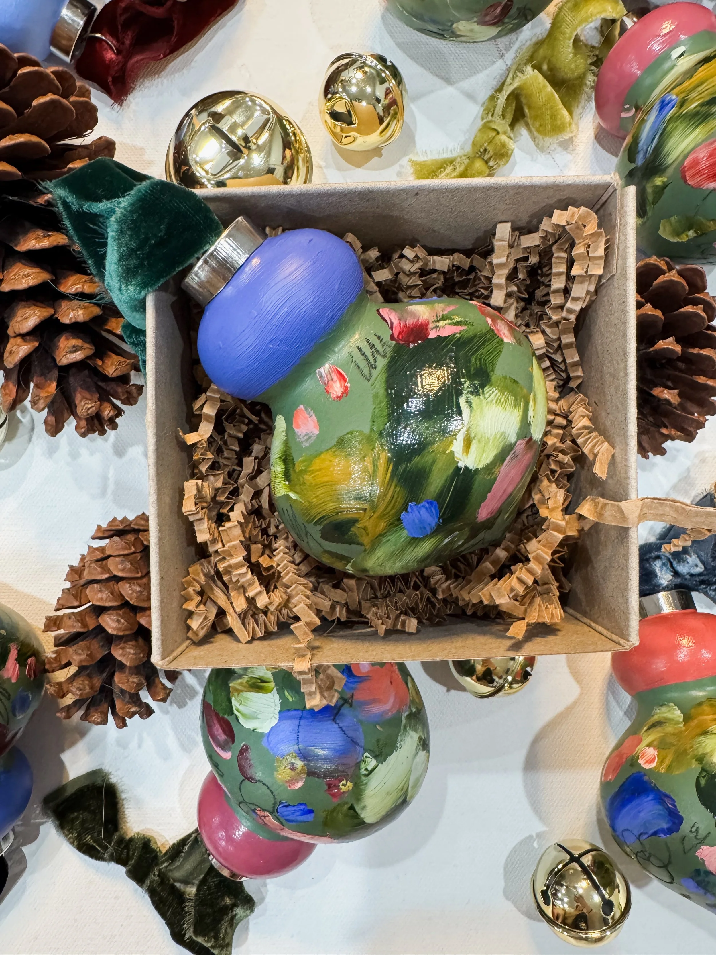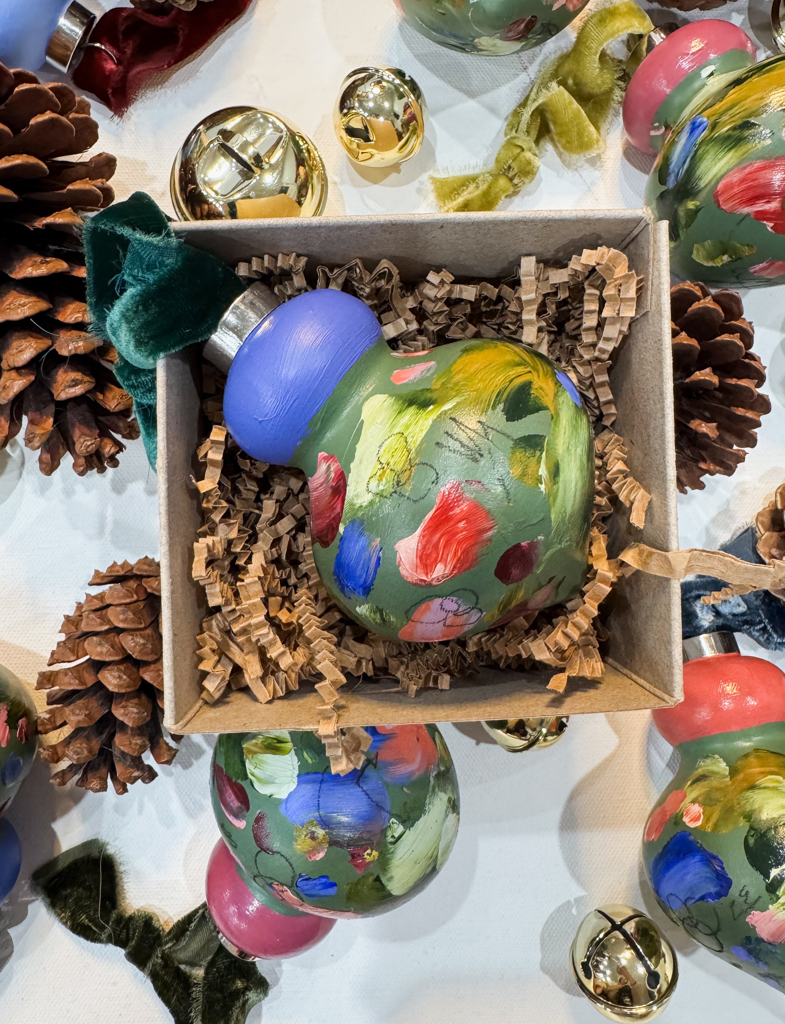2025 “Touched” hand-painted, abstract holiday ornaments inspired by images of fuzzy bees covered in pollen and nectar visiting flower to flower, pollinating them in the process, and the beauty that is multiplied thereafter - by abstract artist, Marcy Parks.